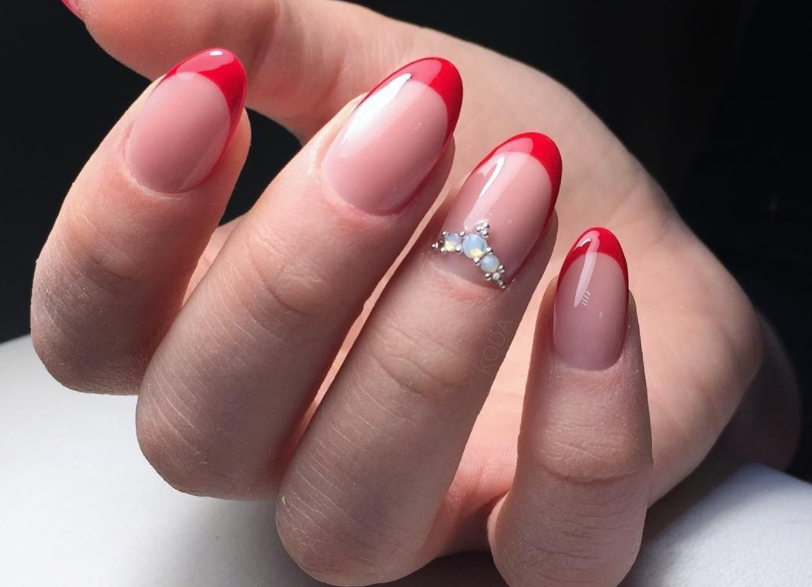 - Добавить изысканности маникюру можно с помощью страз, которые фиксируют у основания ногтя или вдоль линии улыбки.