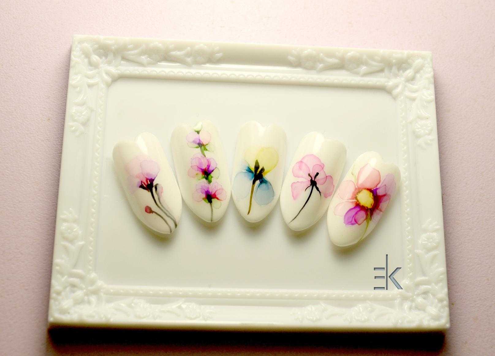Прежде всего, отметим, что такой маникюр предполагает полутона, полупрозрачность красок. Именно это позволяет добиться некой легкости дизайна. Чтобы сделать его таким мастера используют настоящие художественные акварельные краски. Выбрать их не просто, так как далеко не все варианты хорошо ложатся на поверхность ногтевой пластины