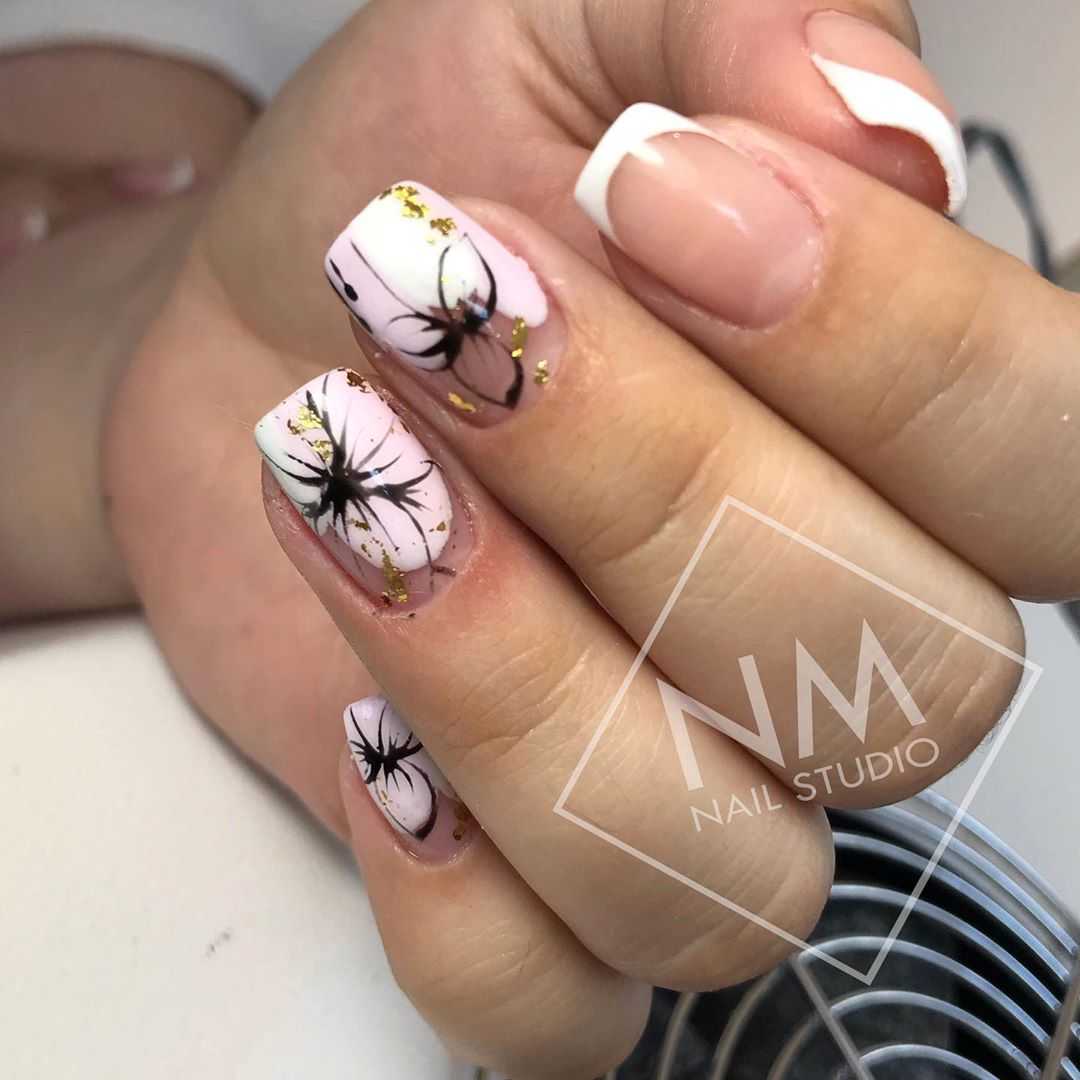 Тренд 2019 сезона – сочетание акварельной росписи с техникой «негативное пространство», которая подразумевает наличие прозрачных участков в нейл-арте. Также на пике популярности матовый топ для такого дизайна.