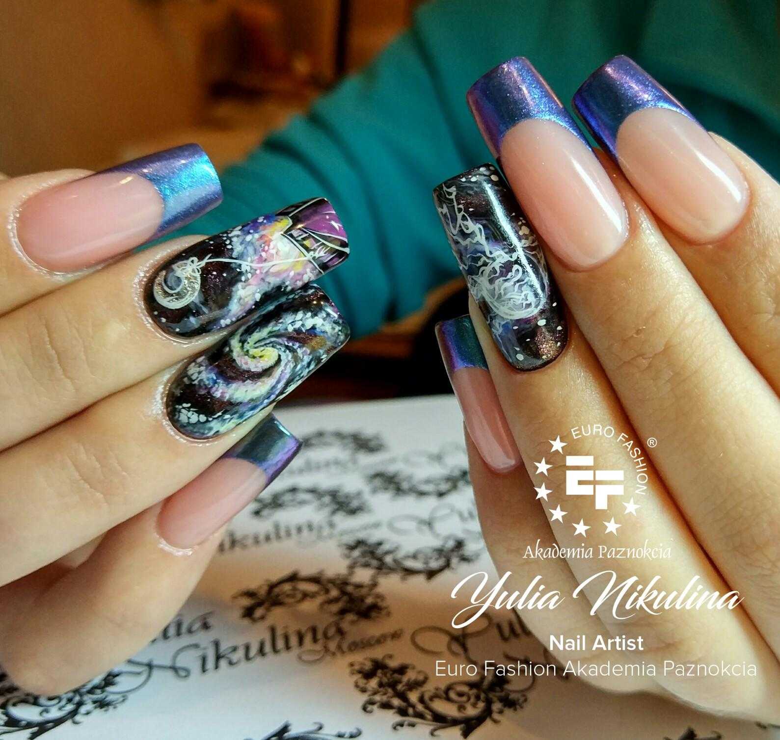 Впрочем, если отходить от классики, легко найти применение и более оригинальным идеям. Переливающийся разными цветами маникюр красиво дополнить: