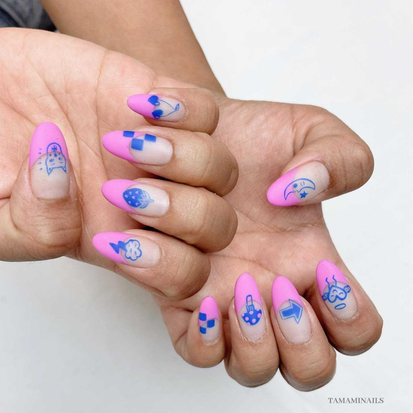 Наивные картинки на ногтях – модный нейл-дизайн в стиле поп-арт. При этом картинок не должно быть слишком много – достаточно украсить несколько ногтей, а для остальных предпочесть френч в комплиментарном оттенке.
