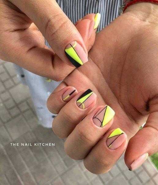 Не смотря на то, что этот дизайн универсален, практичен и нейтрален, он сейчас менее популярен. Да классический френч подходит и под короткую юбку и под вечернее платье и сложно найти более удобный формат, но сейчас на пике популярности нео яркий френч который создается из смеси нескольких техник и обыгрывается абстрактными узорами.