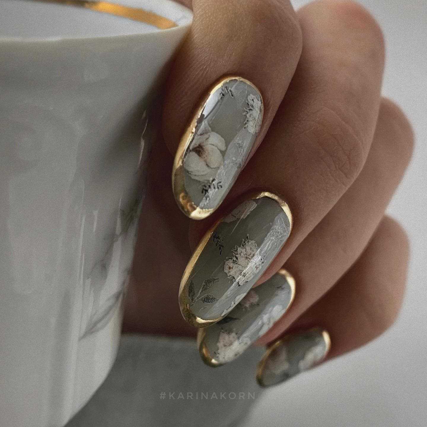 Очень красивый арт френч на ногтях напоминает хлопья патали. Здесь край ногтя кажется украшенным тонкой золотистой фольгой, что выглядит очень необычно и стильно. Такой маникюр идеален для вечерних выходов.