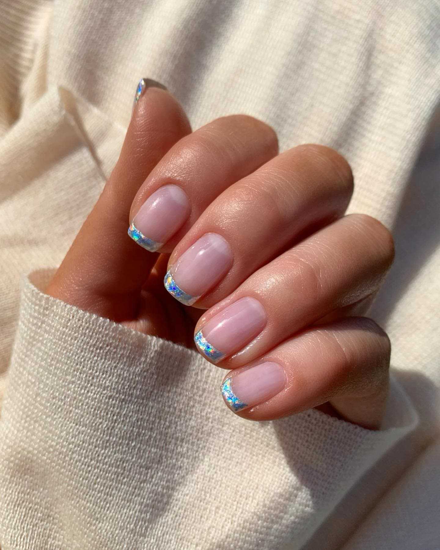 Нарядный вариант, при котором край ногтя украшается темным лаком и блестками, которые создают градиент с чистой ногтевой пластиной. Для стиля миллениум подходит лак стального, золотого или серебряного цвета.