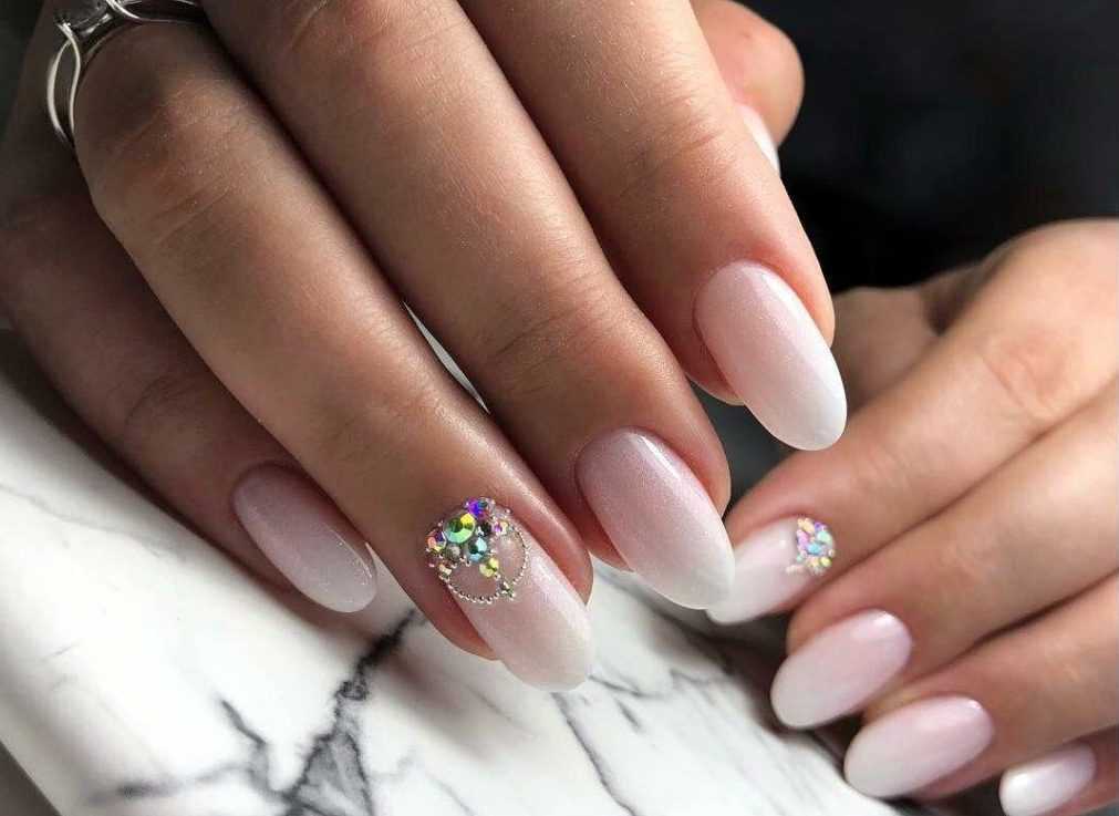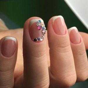 Нелепо смотрится большое количество блесток и страз. Поэтому, при нанесении французского маникюра в этом сезоне, следует ограничиться минимальным их количеством. Для коротких ноготков идеально подходит вариант украшения не всех пальцев, а только одного или двух.