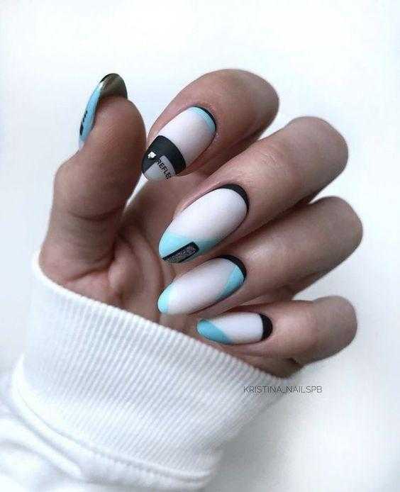 Разбавить композицию помогут белые полоски. А блестки в одном из секторов ногтя добавят яркости любому образу.