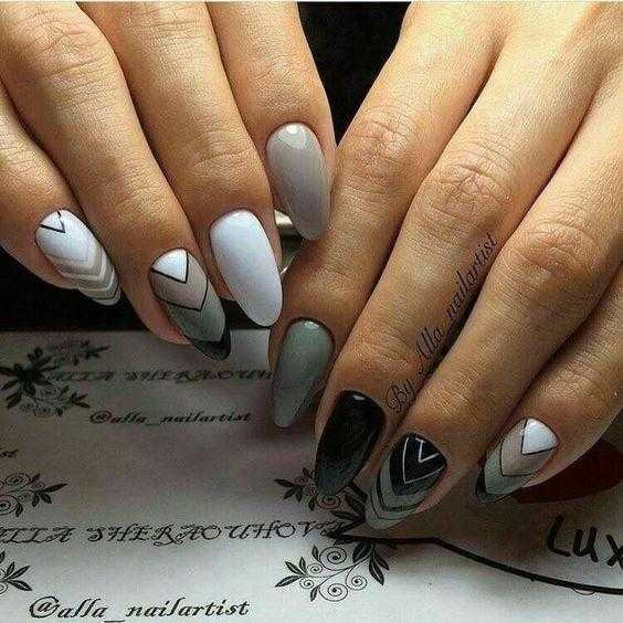Несколько цветов в дизайне позволят создать оригинальный вид для ногтей. Для создания геометрической композиции применяются акриловые краски.Сочетание черного, розового и сиреневого смотрится оригинально.
