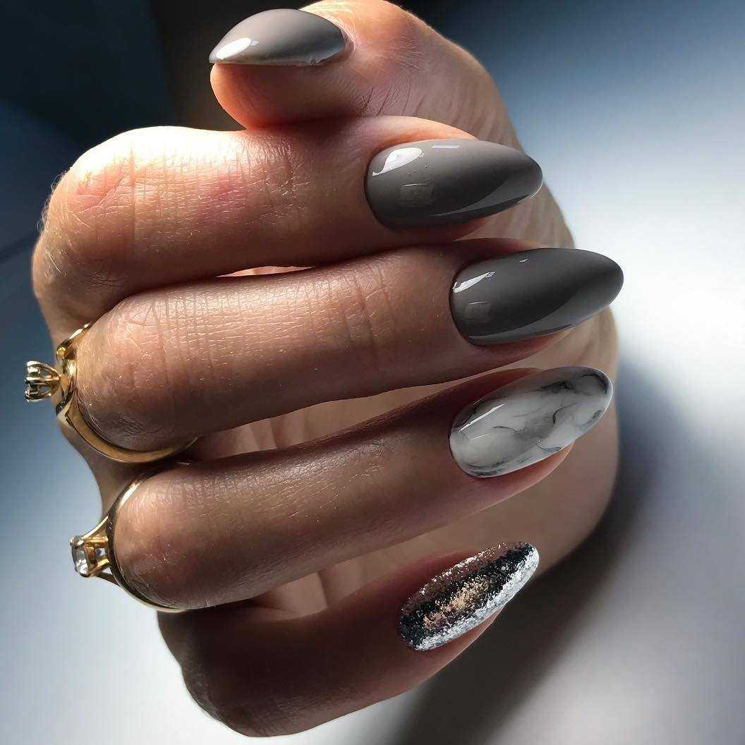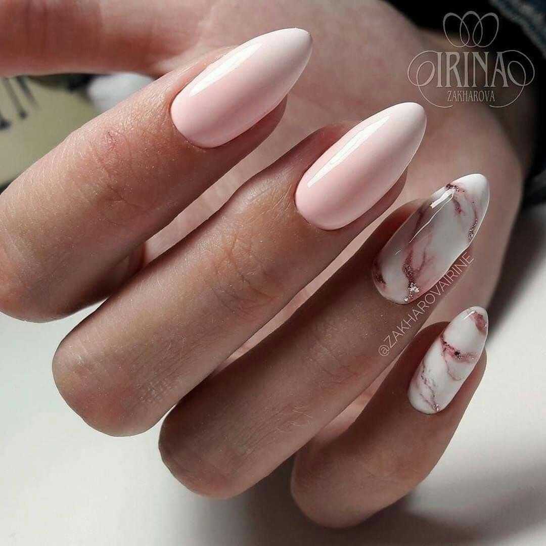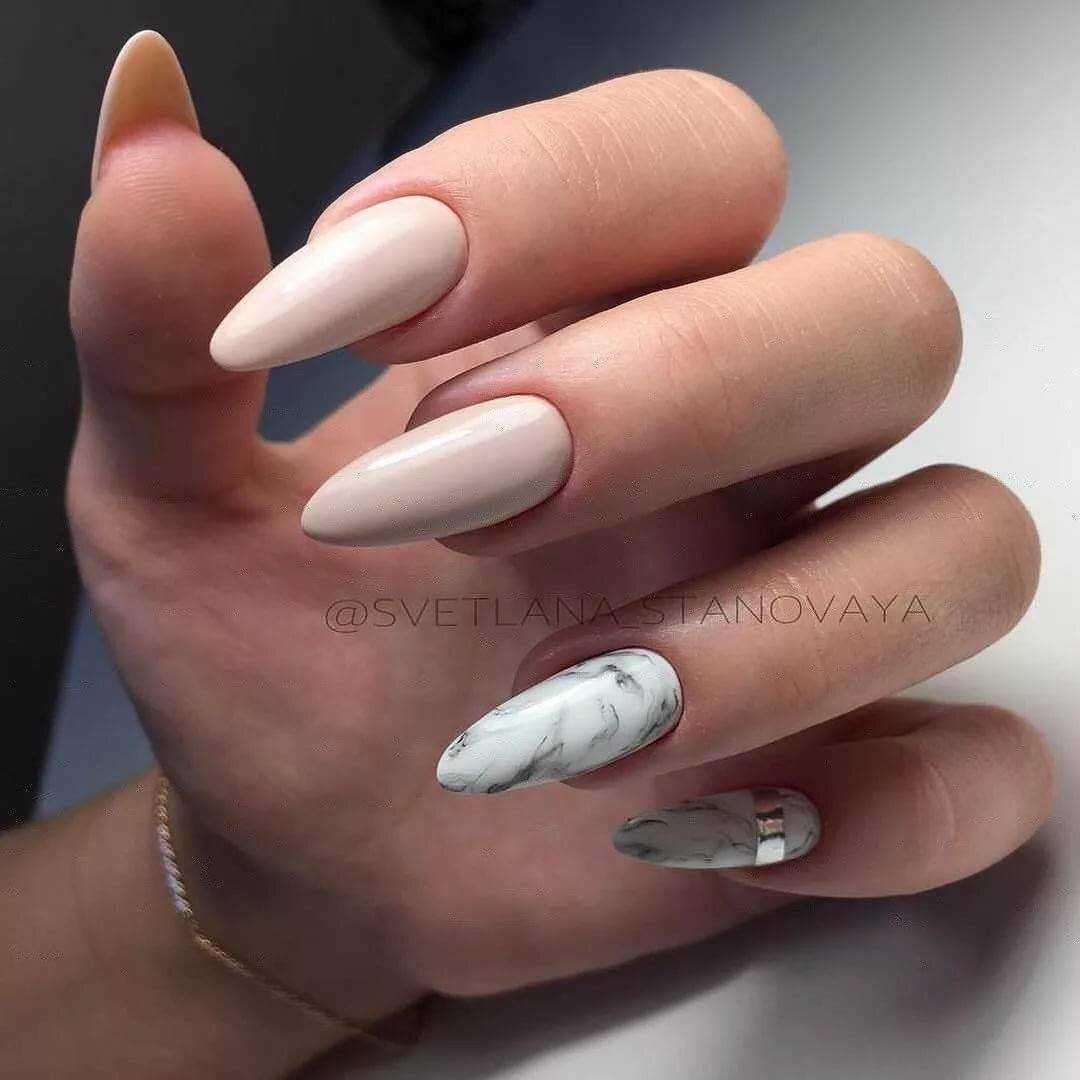 Мраморный дизайн смотрится красиво только на миндальных ногтях. Возможны варианты декора квадратных ногтей, но на них он смотрится менее привлекательно. Мраморный маникюр отлично гармонирует с белым, серым, кремовым гель-лаком.