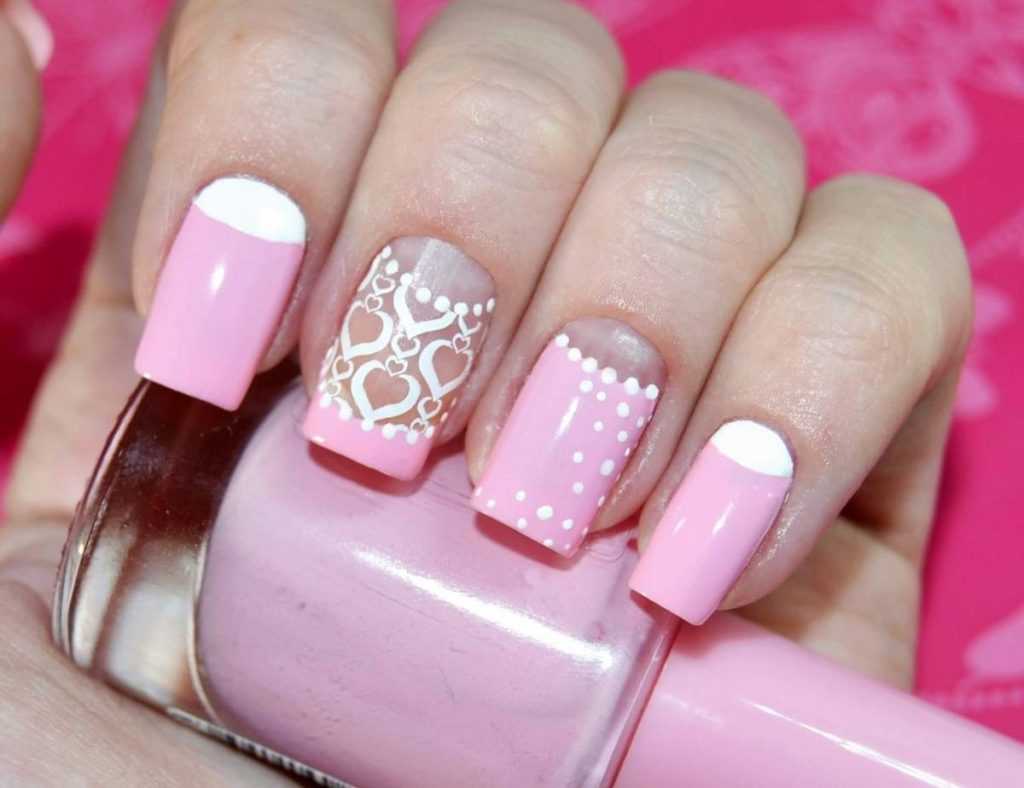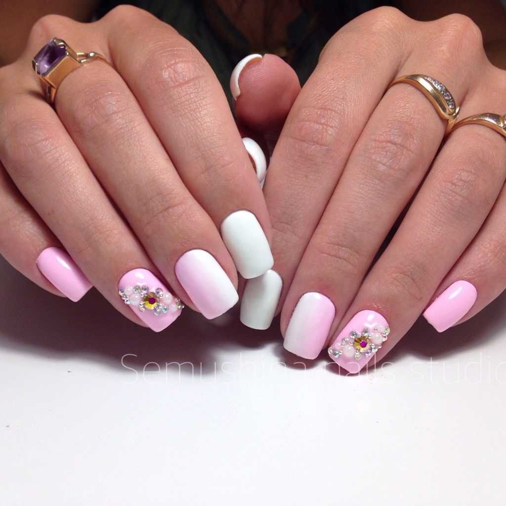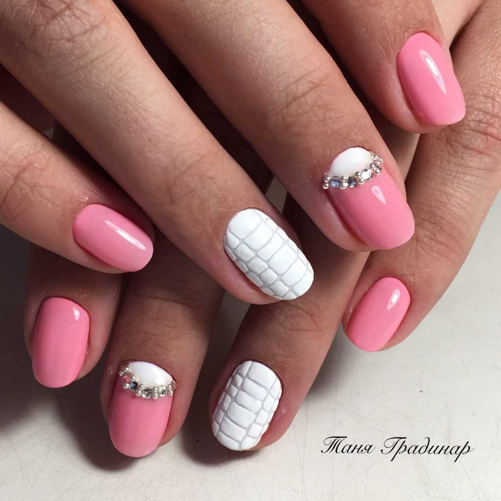 Одно из самых гармоничных и утончённых сочетаний – розовый с белым. С последним цветом можно сочетать как яркие оттенки, так и приглушённые. В дополнении с цветочной росписью каждый из представленных вариантов маникюра смотрится изысканно и романтично.
