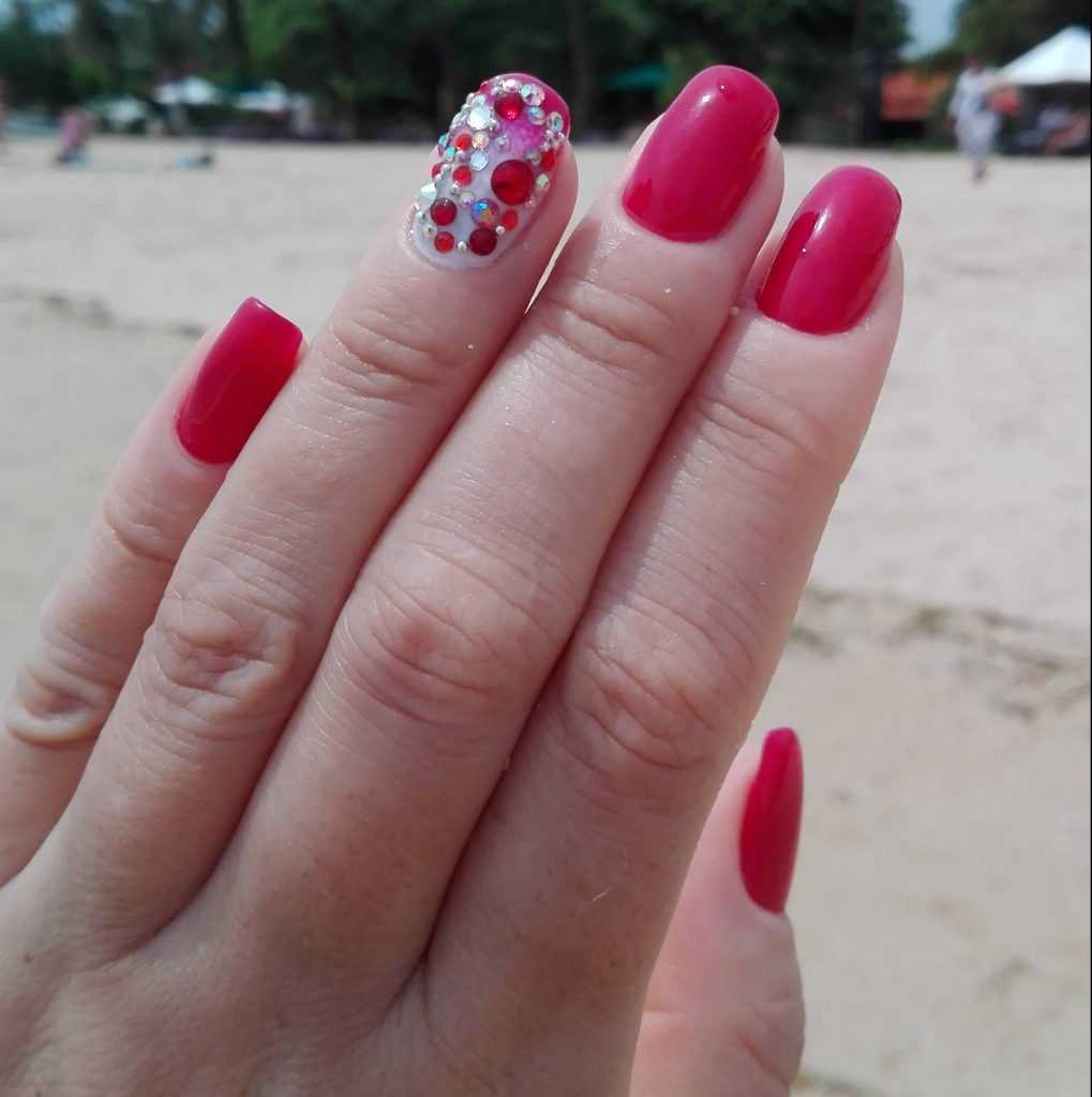 - Дизайн с акцентом. Один или два ноготка украшают специальными бусинками, стразами. Также уместно нанесение водных стикеров (трафаретов). Опытные мастера делают аппликации, объёмные рисунки.