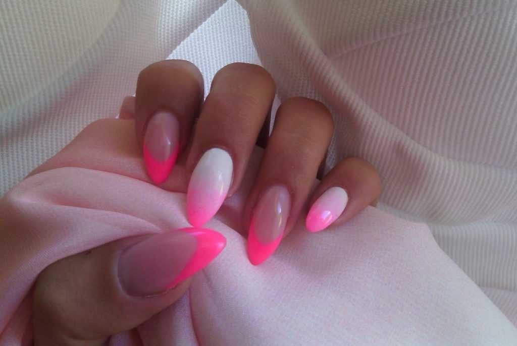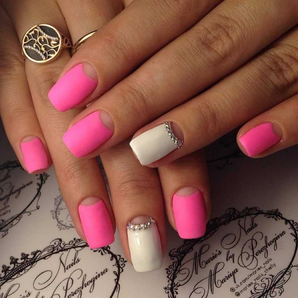 Ярко розовый маникюр отлично будут смотреться в сочетании с белыми полосками, геометрическими фигурами или маленькими точками. Также их можно отделать блестками, фольгой или камнями, сделать концы ноготков разноцветными.