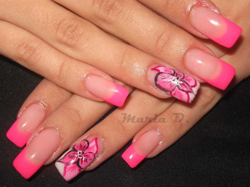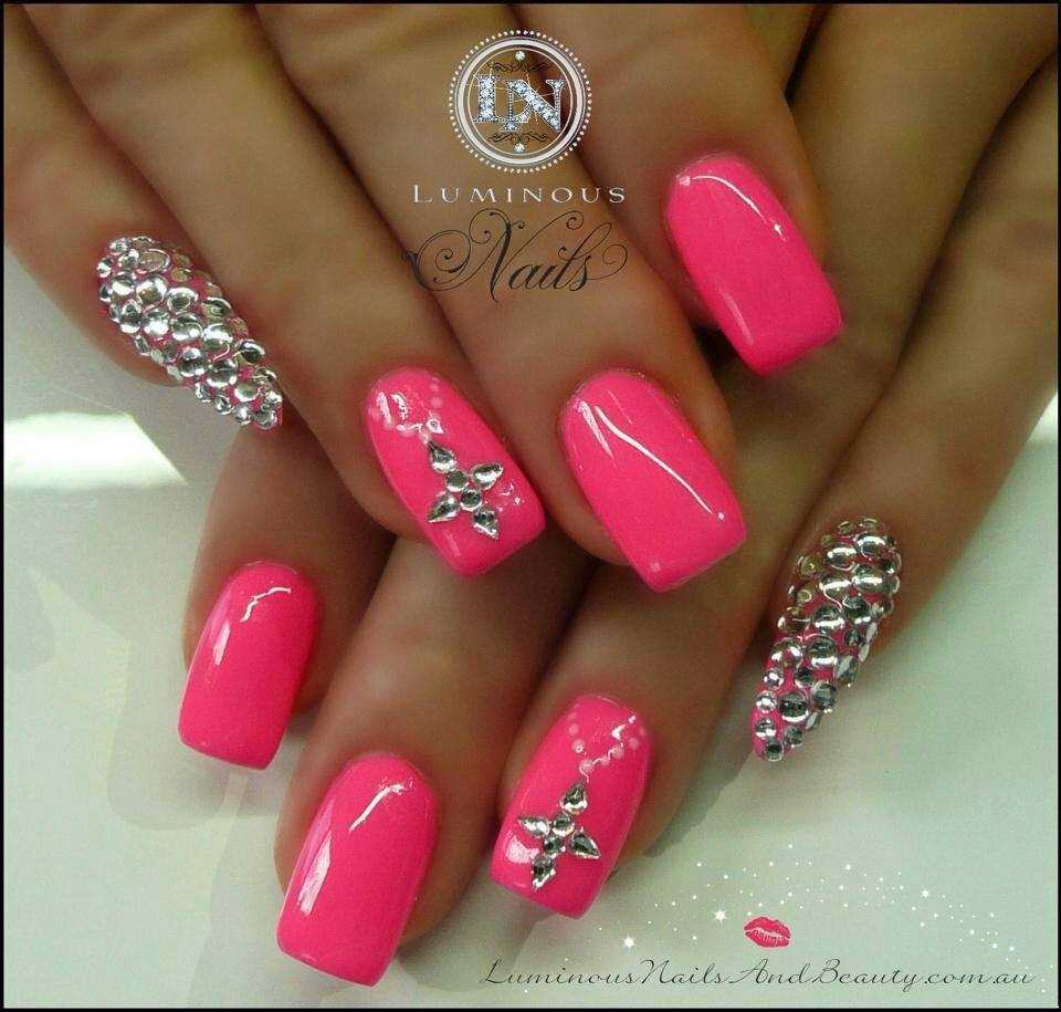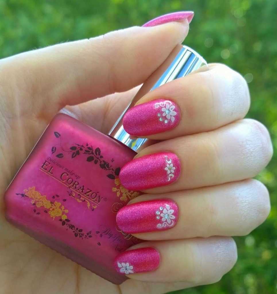 Тем, кто любит обратить на себя внимание и блистать в самом эпицентре праздника, могут понравиться варианты ярко-розового цветочного маникюра, дополненным стразами или блестящим акриловым напылением