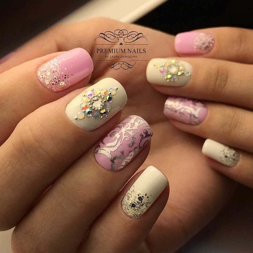 Затем идут маникюры с 3D глиттером (на одном или всех ногтях) или розовые нейл-арты с драгоценными украшениями. У вас загорелая кожа? Выбирайте молочно-розовый: именно этот оттенок лучше всего подчеркнет цвет лица.