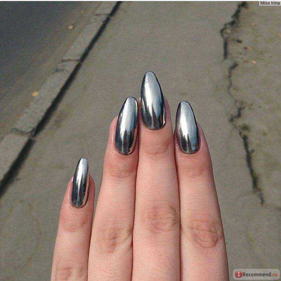 Также ногти можно украшать золотом и серебром или другими «металлическими» оттенками. Для этого лучше всего подойдет модная в новом сезоне втирка. Здесь предлагается широкий спектр возможностей. Втирка может быть любого оттенка. Она представлена в матовом и зеркально-глянцевом варианте. Также есть металлические и жемчужные покрытия, блеск которых несколько отличается друг от друга. Втирка на миндалевидных ногтях может быть использована как самостоятельно, так и в сочетании с другими техниками. Например, эффектно смотрится втирака с френчем, антифренчем, рисунками, комбинированием глянца и матового варианта. Также втирку используют в сочетании с цветным гель-лаком.