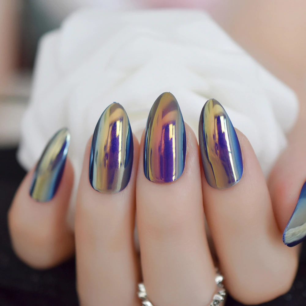 Не менее эффектно на миндалевидных ногтях смотрится «битое стекло» и другие фактурные покрытия. С их помощью можно создавать неповторимые по красоте и изысканности варианты в любой цветовой гамме.