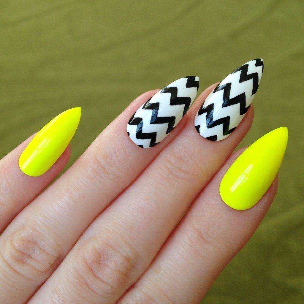 Полосы, как и линии в геометрической интерпретации уже несколько последних лет остаются популярными, когда речь идет о выполнении маникюра на миндалевидных ногтях.