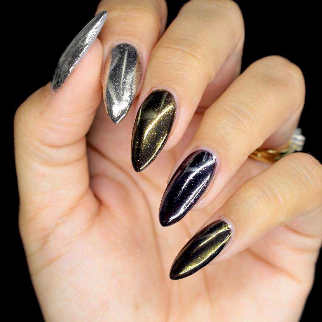 Фольга шикарно соединяется с классическим нюдом, любыми яркими тонами и даже абстракционизмом. Глиттеры, стразы и втирки также хорошо дополняют металлический слой.