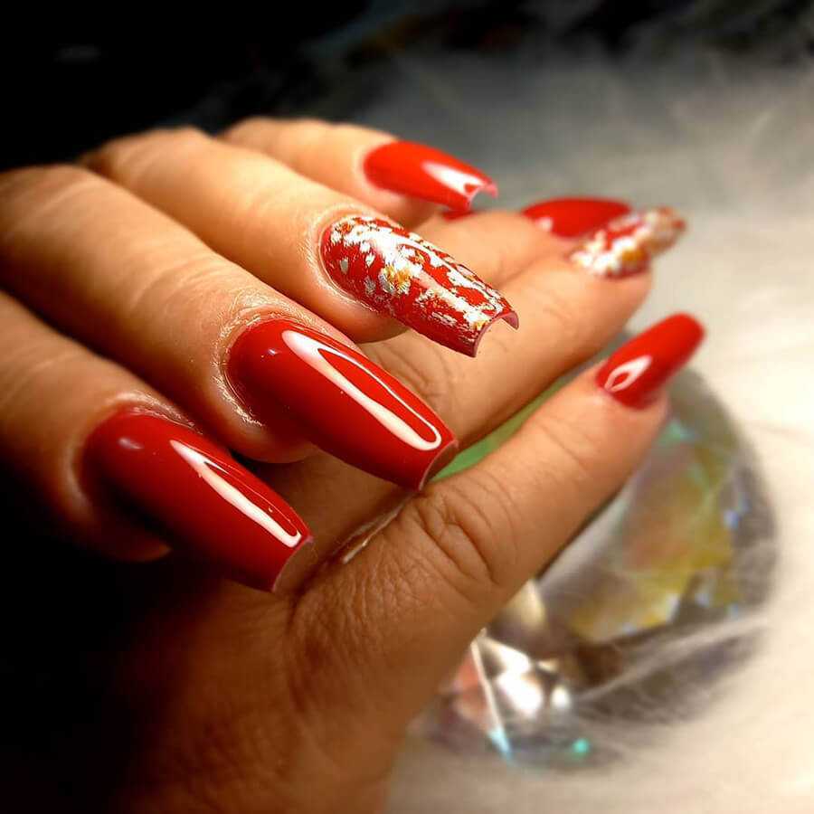 Маникюр с фольгой выполняется в различных вариантах. Такой дизайн потрясающе смотрится, становится изюминкой образа.
