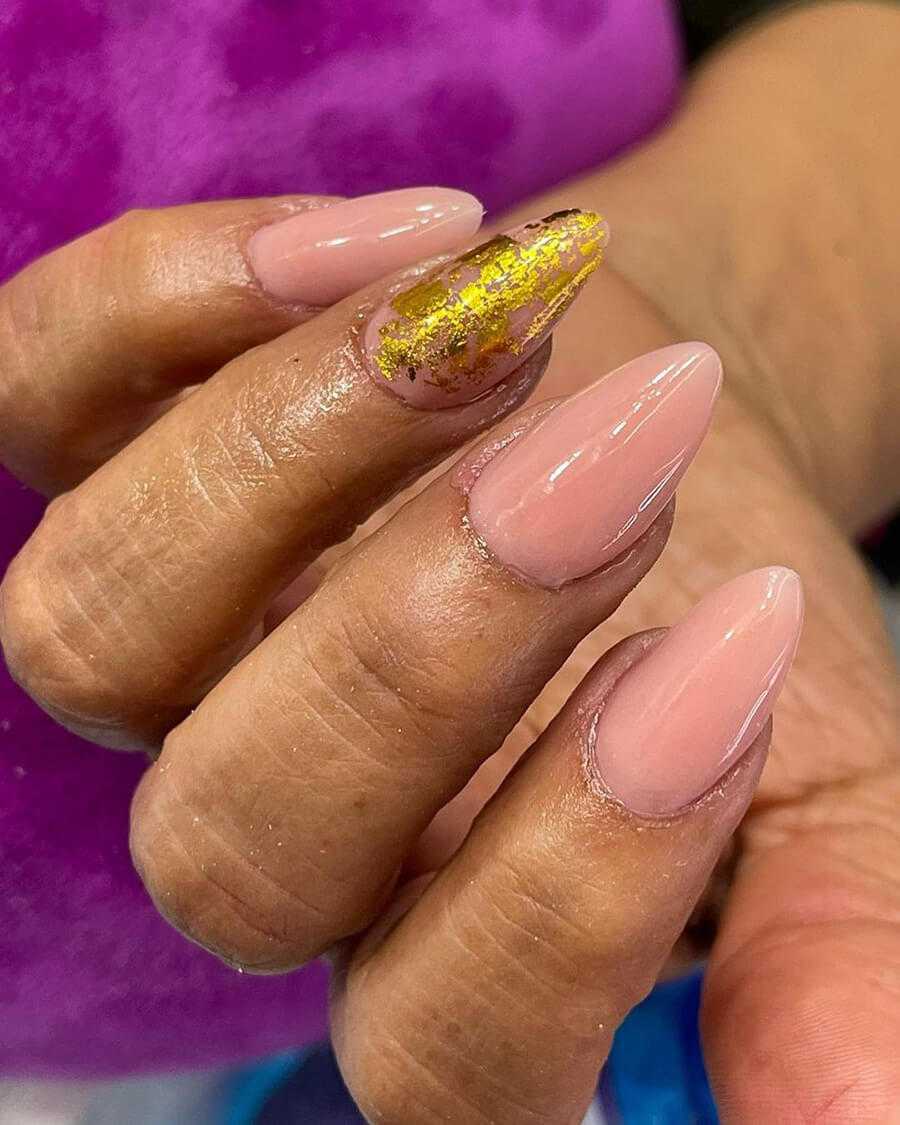 Очень хорошо сочетается золото с нюдовым покрытием на коротких ногтях. Такой аккуратный и опрятный маникюр можно смело носить в повседневной жизни.