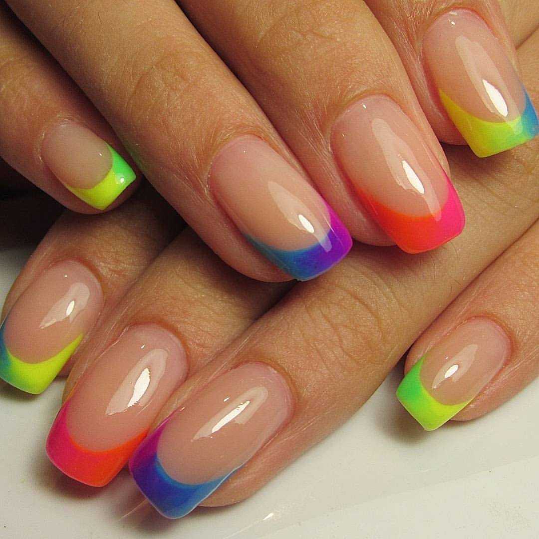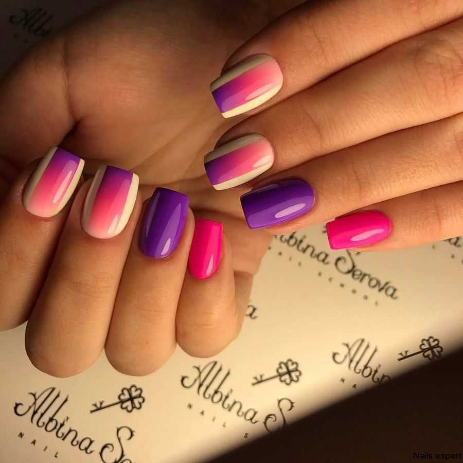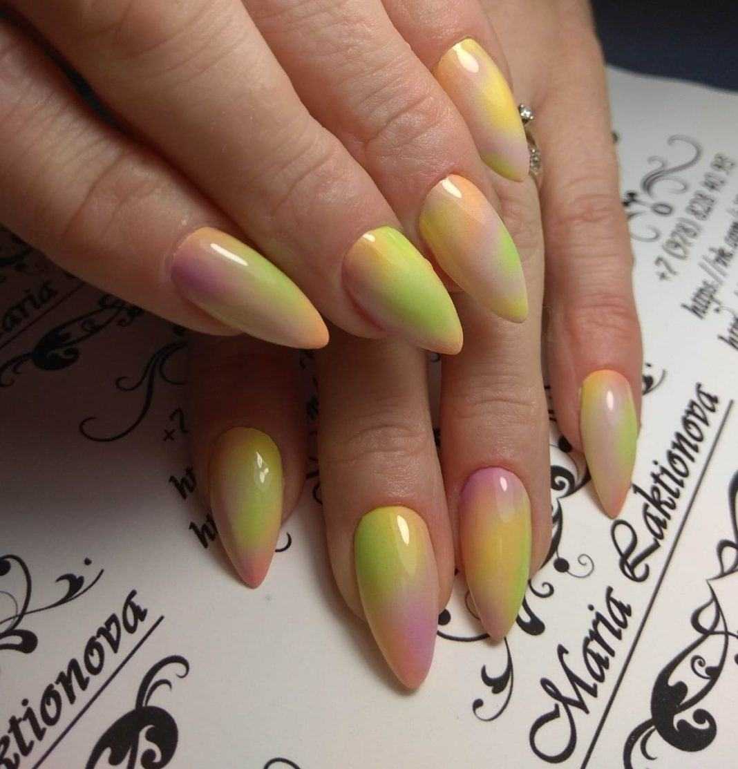 Дизайн этого вида маникюра допускает использовать от двух до пяти цветов – большее количество на ногтевой пластине не поместится, да сложно обеспечить плавность перехода оттенков.