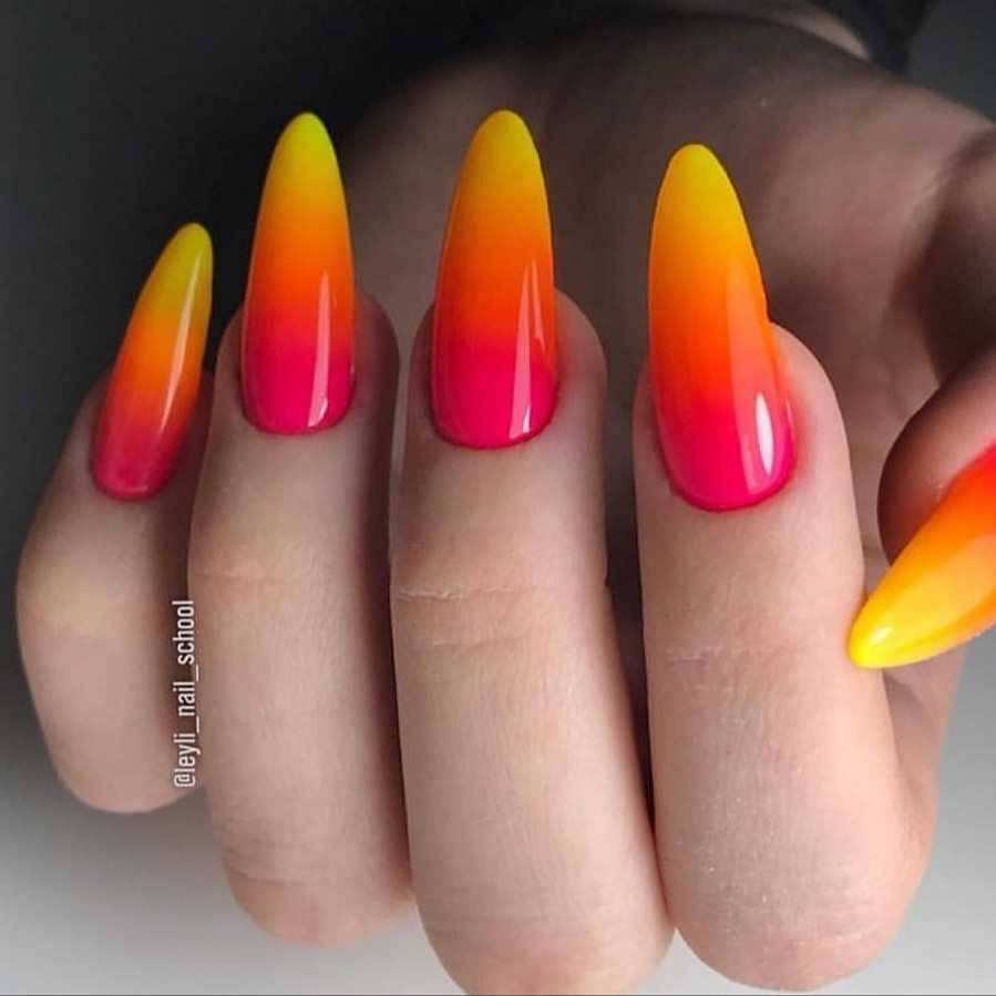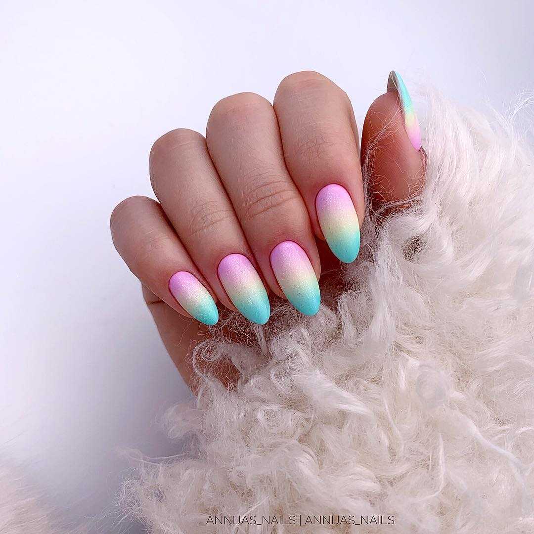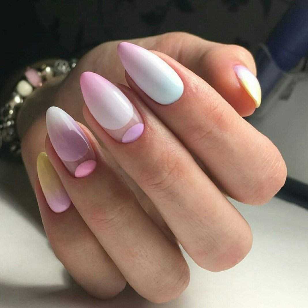 Дизайн этого вида маникюра допускает использовать от двух до пяти цветов – большее количество на ногтевой пластине не поместится, да сложно обеспечить плавность перехода оттенков.