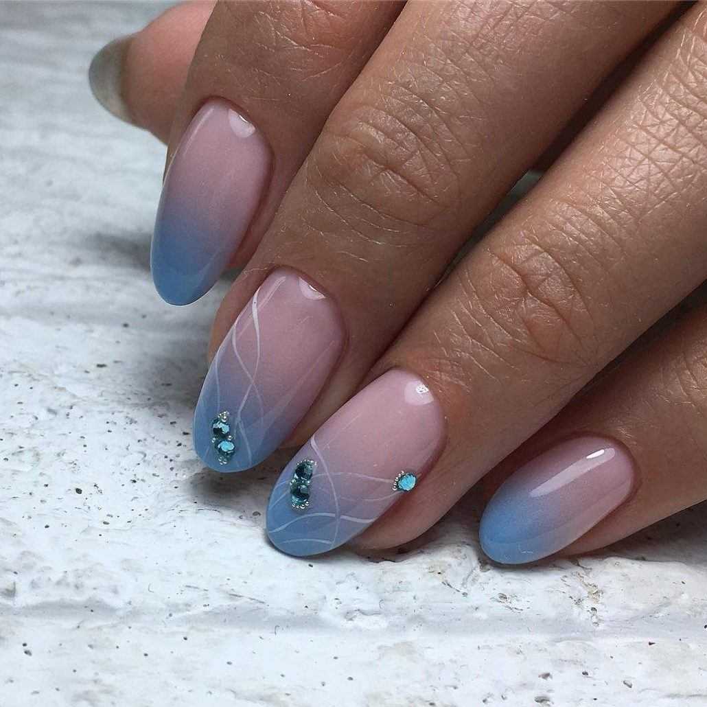 Большая или средняя длина больше подходит для омбре. Здесь получится растянуть цвет от более темного базового оттенка к светлому кончику. Ногти визуально удлинятся, а руки станут более изящными. Градиентный дизайн на длинной базе можно дополнить декором — втиркой, стразами или рисунком в стиле минимализм.