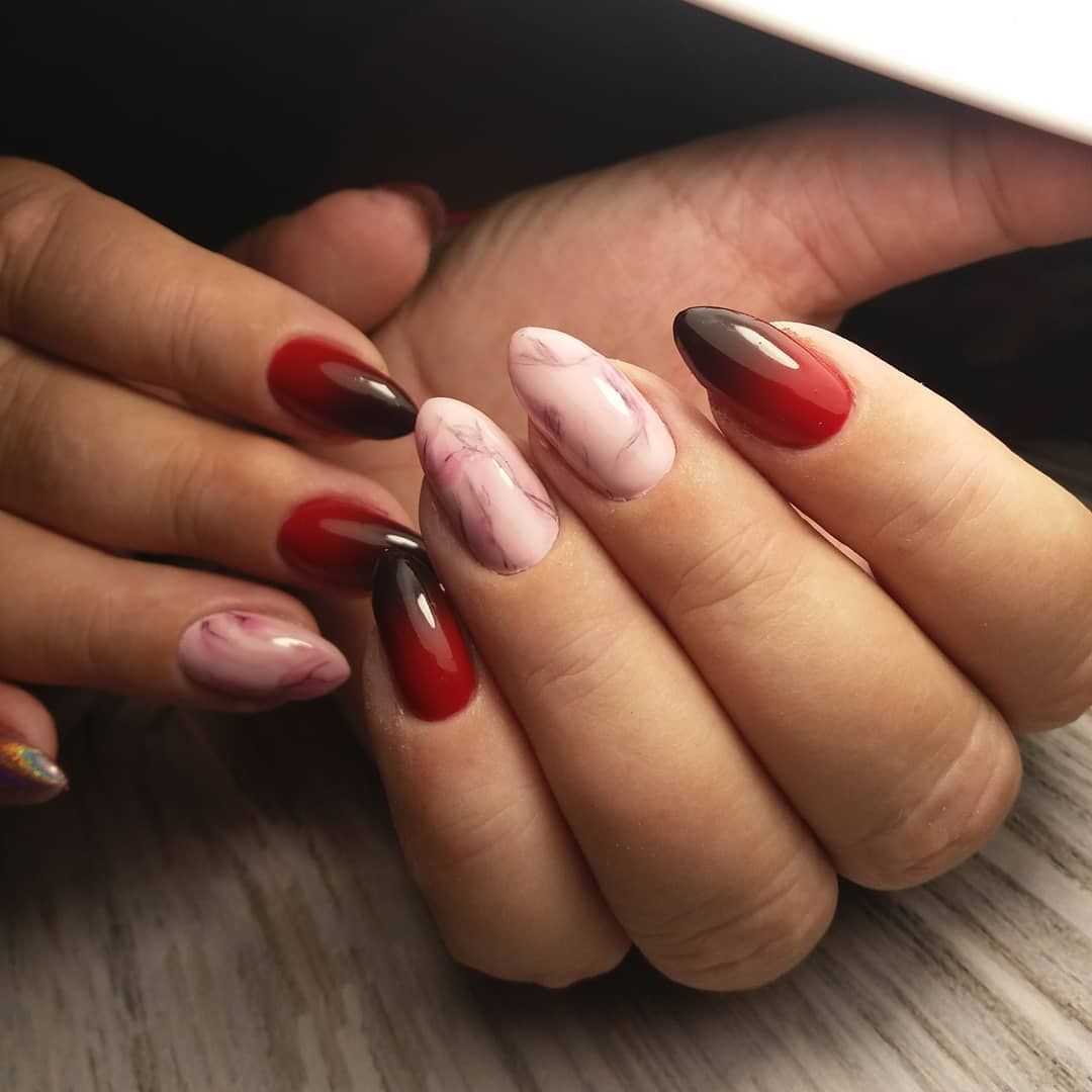 Также амбре можно делать и гель-лаком. Это может быть светлый маникюр, яркий или темный, главное, чтобы цвета лаков хорошо сочетались между собой. Чтобы получить «лунный» эффект, который сейчас находится на пике популярности, используйте цвета так, чтобы у основания ногтя был светлый тон.