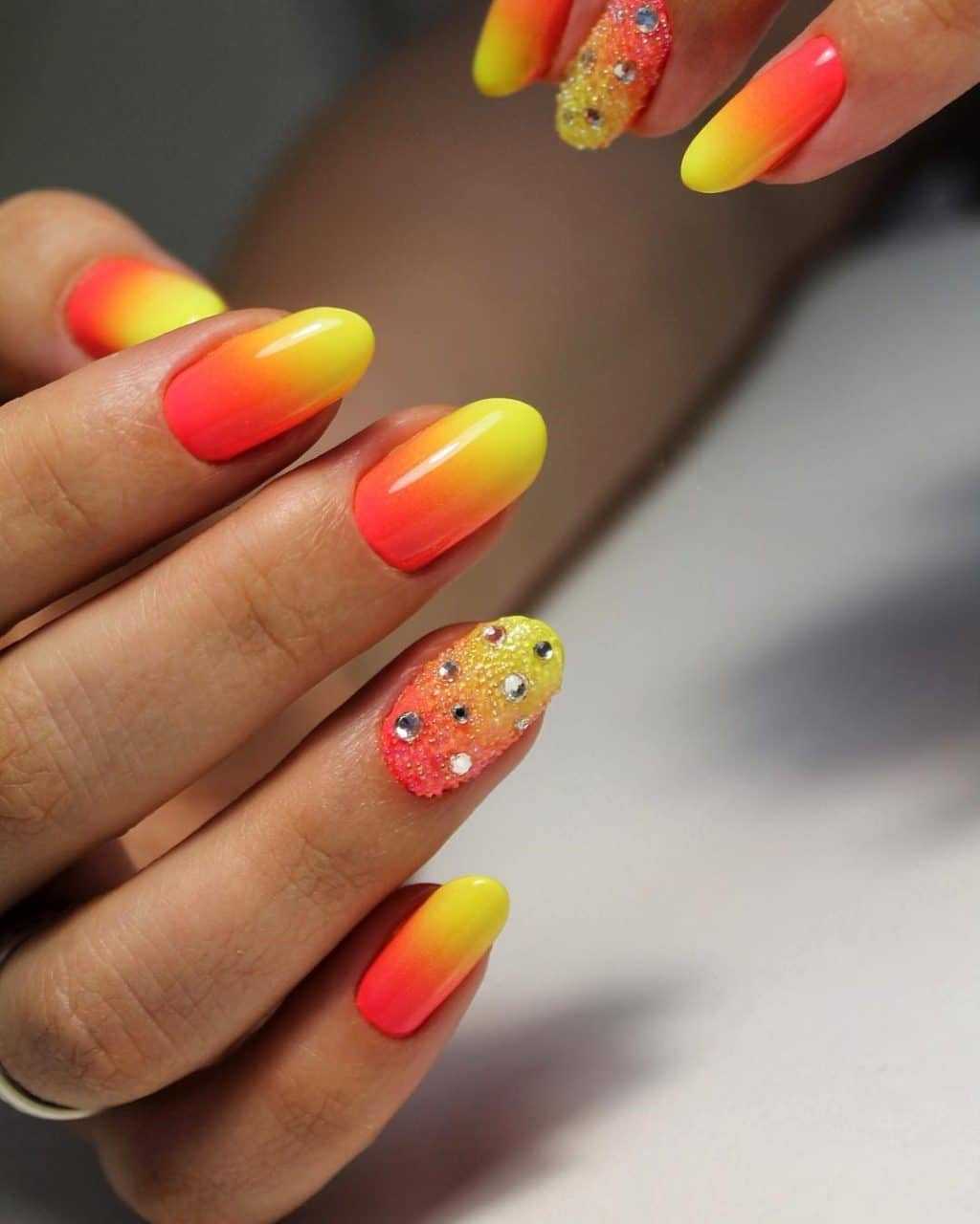 Омбре 2019 в стиле френч также можно приурочить к сезону: весной, например, используйте сочные жизнеутверждающие краски, а летом — обжигающую желтую и оранжевую палитру. А чтобы сделать элегантный френч еще более привлекательным, попробуйте дополнить его глиттером, стразами и блестками, но не в коем случае не забывайте о чувстве меры.