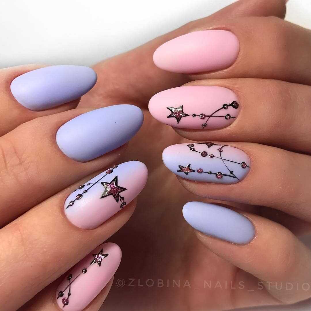 Нейл-арт – здесь градиент является только фоном. Поверх наносится рисунок. Техника нанесения – на усмотрение мастера или вашего желания – кисточкой, стемпингом, наклейка.