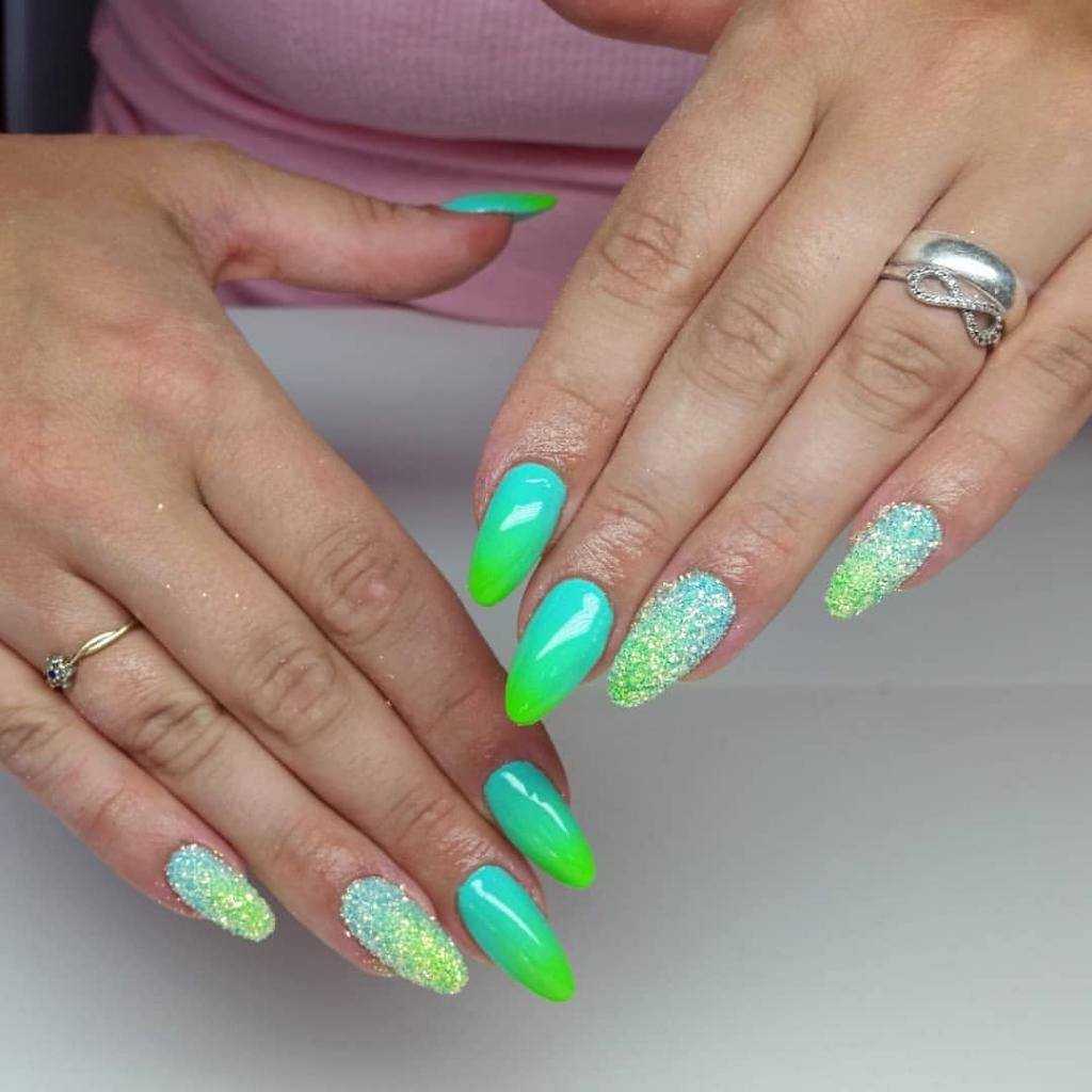 - Градиентный омбре маникюр с мерцающей глиттерной пудрой. Для создания яркого и красивого эффекта на ногтях используйте глиттерную пудру в нескольких оттенках одного цвета. Нанесите первый оттенок на кончик ногтя, затем добавьте следующий оттенок глиттерной пудры, перемешайте и плавно переходите к основанию ногтя. Повторите этот процесс, пока не достигнете нужного эффекта.