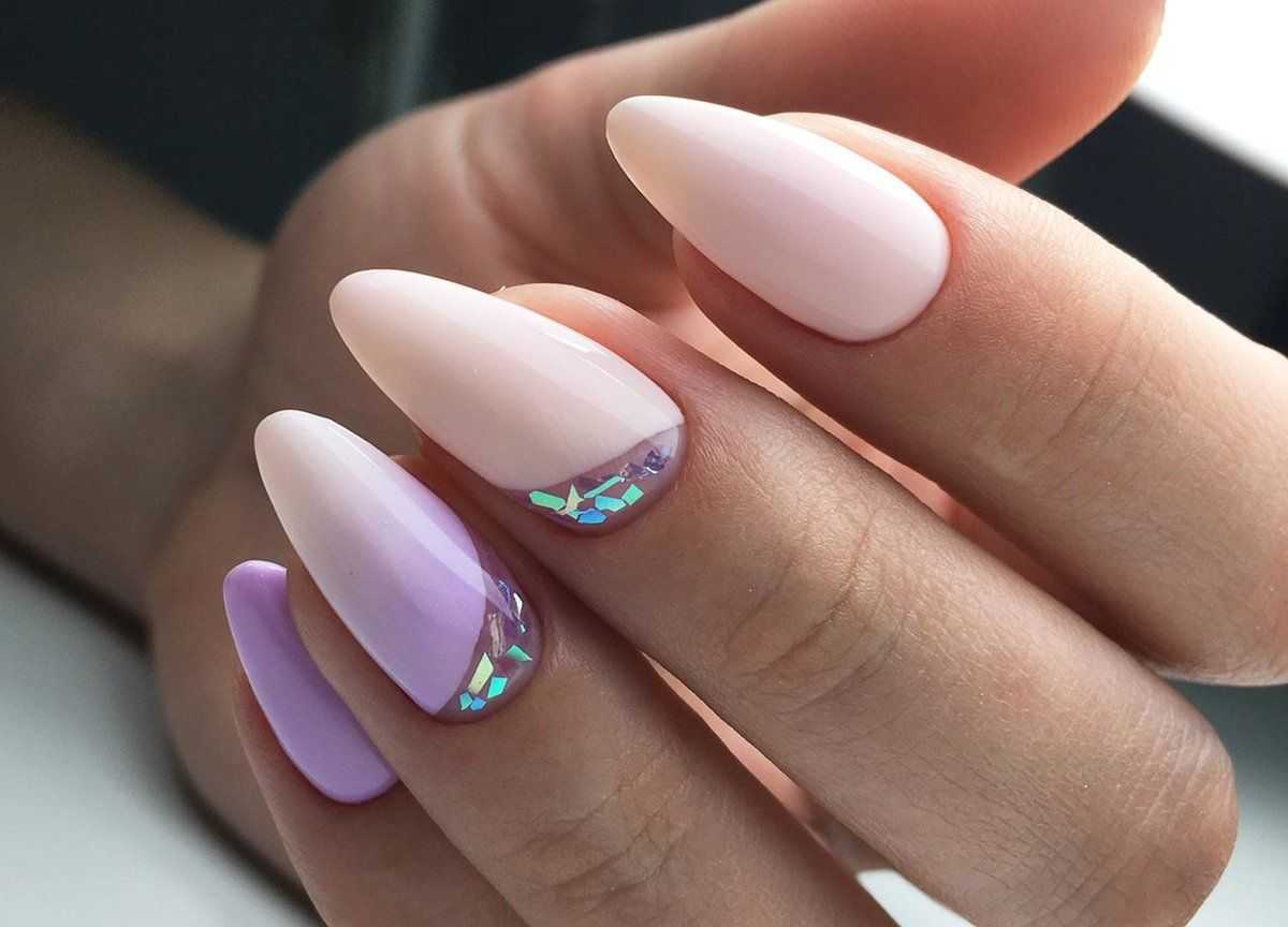 Миндаль — максимально женственная форма ногтей. К ней лучше подбирать маникюр с пастельными или нюдовыми оттенками лака. Растяжка сделает пластину более изящной, а кисти — длинными и тонкими.