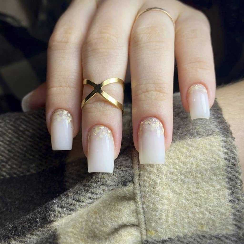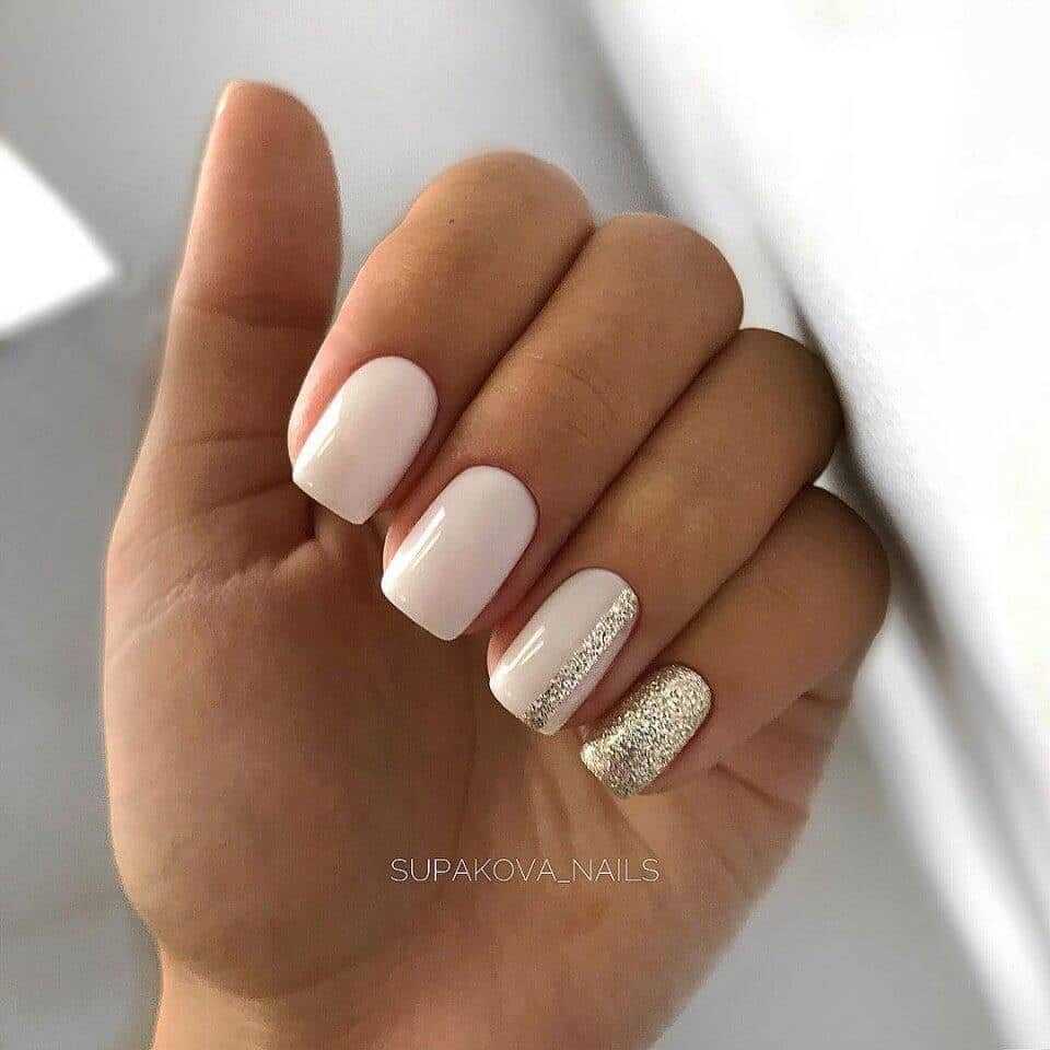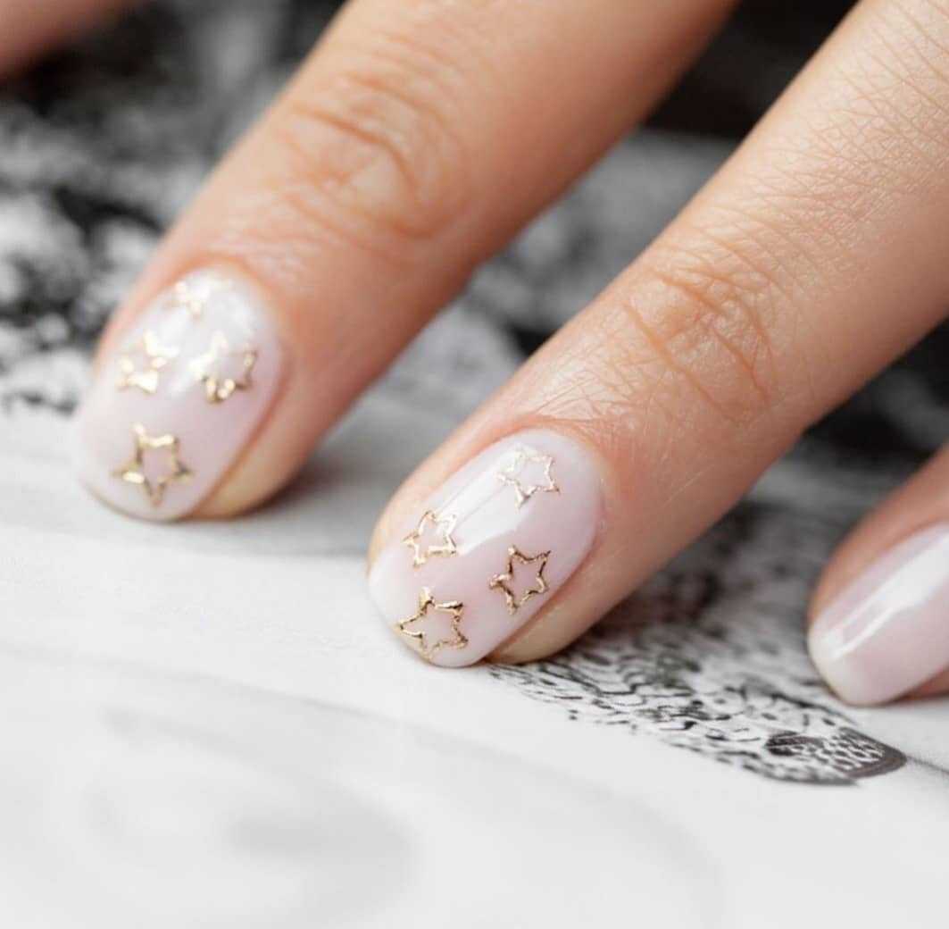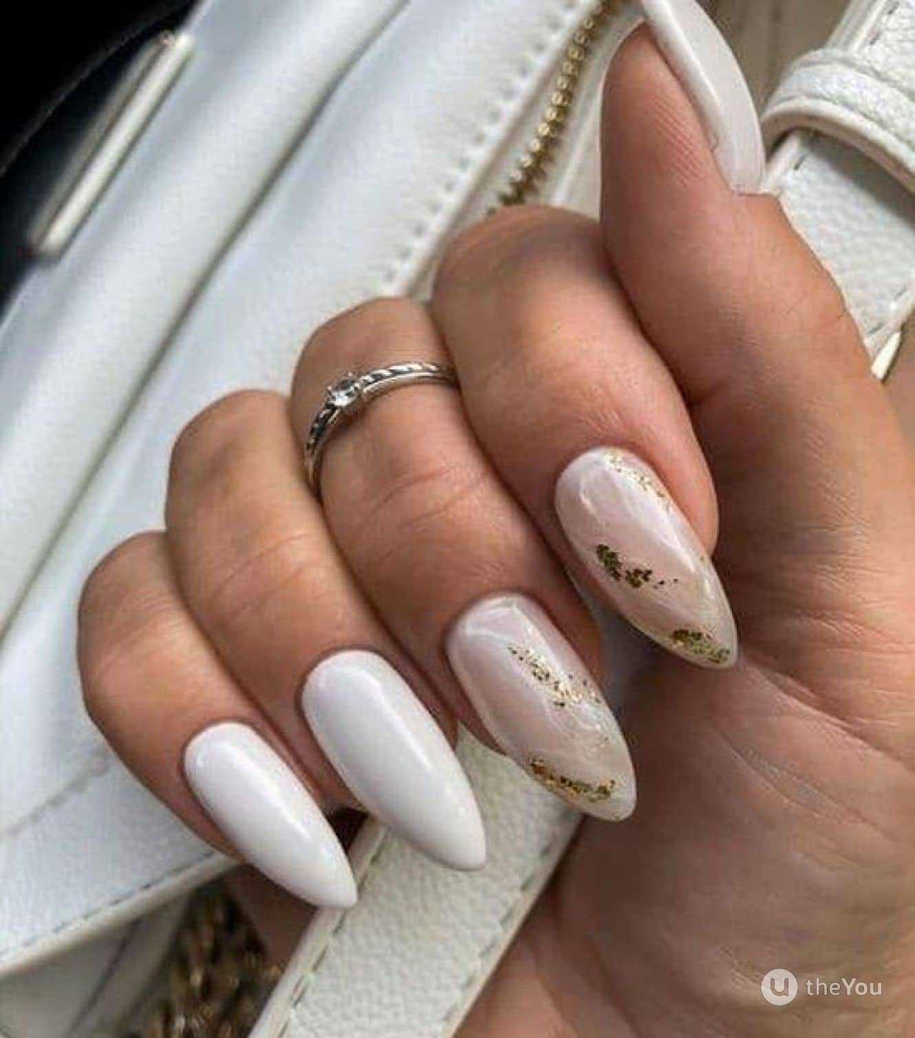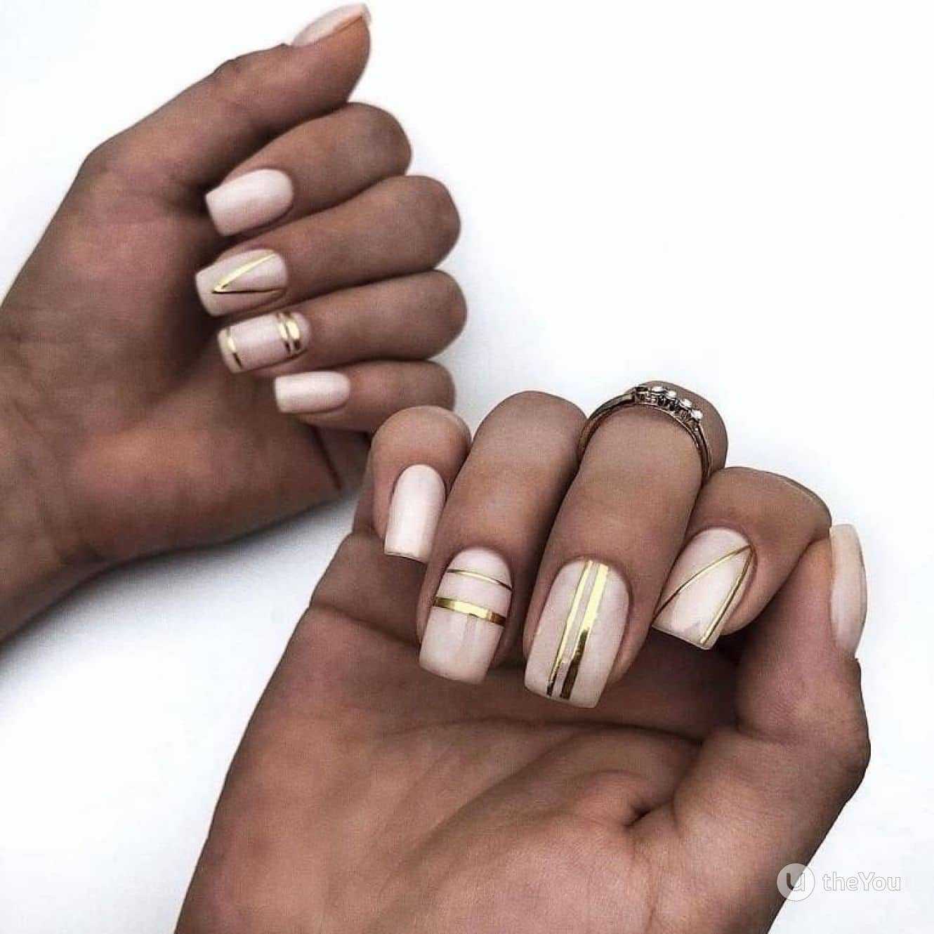 Золотой цвет добавит немного блеска и шика молочному маникюру. Вы можете использовать золотой цвет для акцента на одном или нескольких ногтях, либо использовать его в качестве декоративного элемента