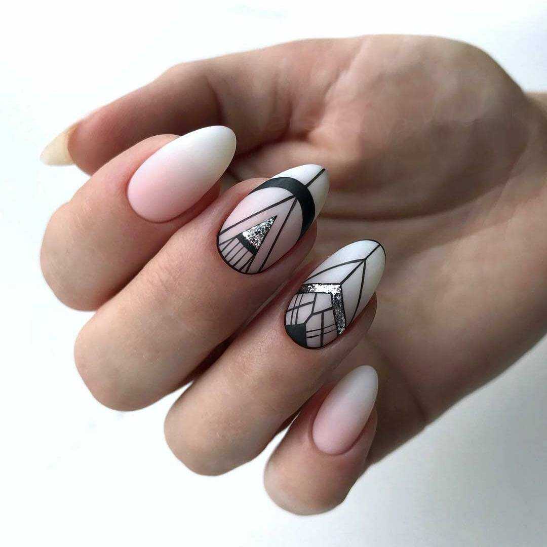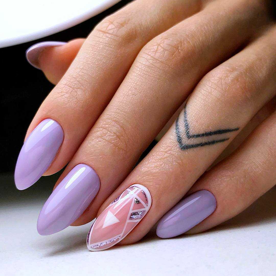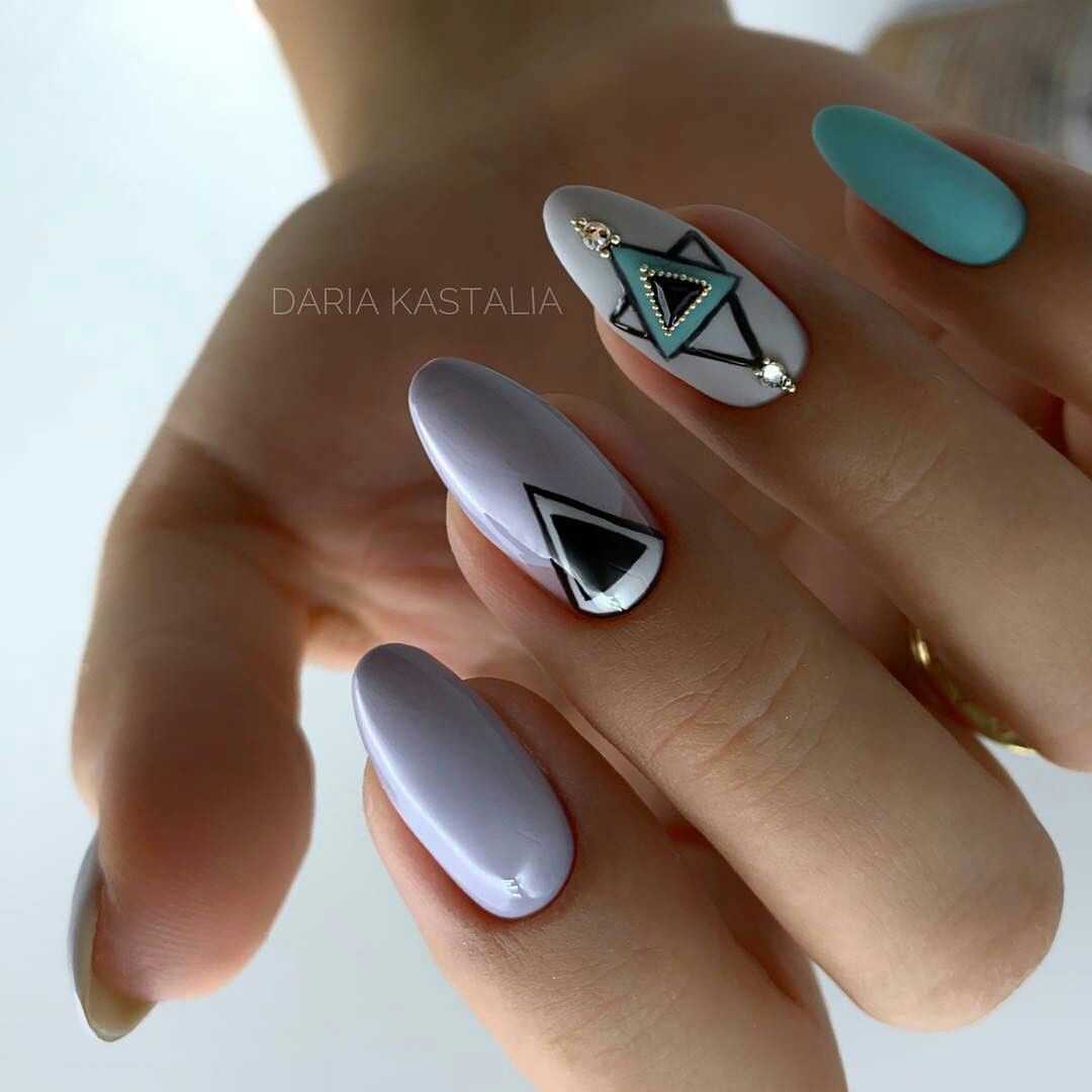 Что касается овальных ногтей, то на них отлично смотрится декор треугольниками, тонкими линиями и другим декором, который не входит в диссонанс с округлой формой.