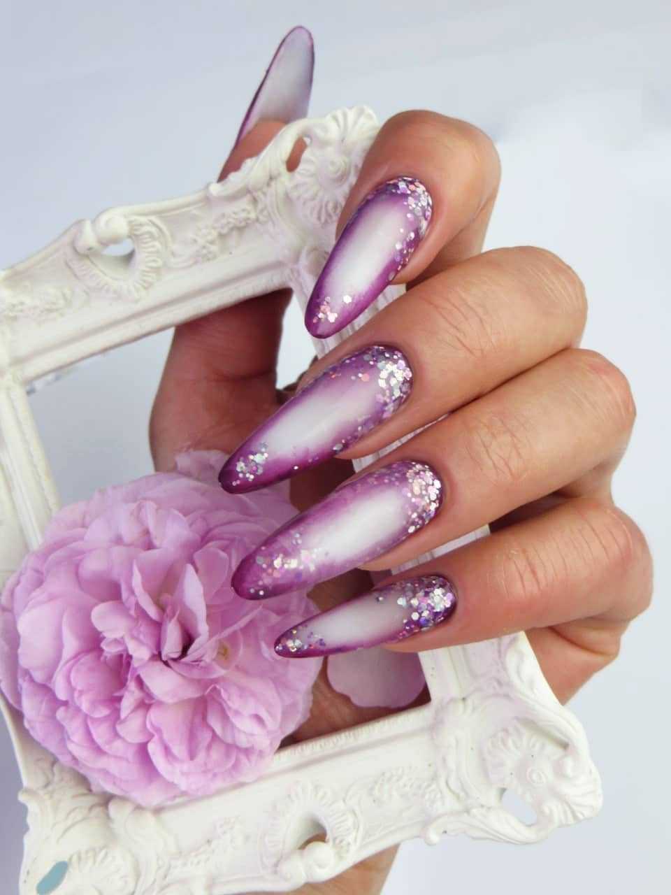 Кажется блестки уже никогда не выйдут из моды нейл арта. Несмотря на всю помпезность, этот вариант дизайна выбирает большое количество женщин. Чтобы снизить эффект новогодней елки, блестки сейчас используют в самом выгодном варианте. Можно покрыть несколько ногтей, а можно растянуть их от кутикулы к краю, создавая эффект градиента.