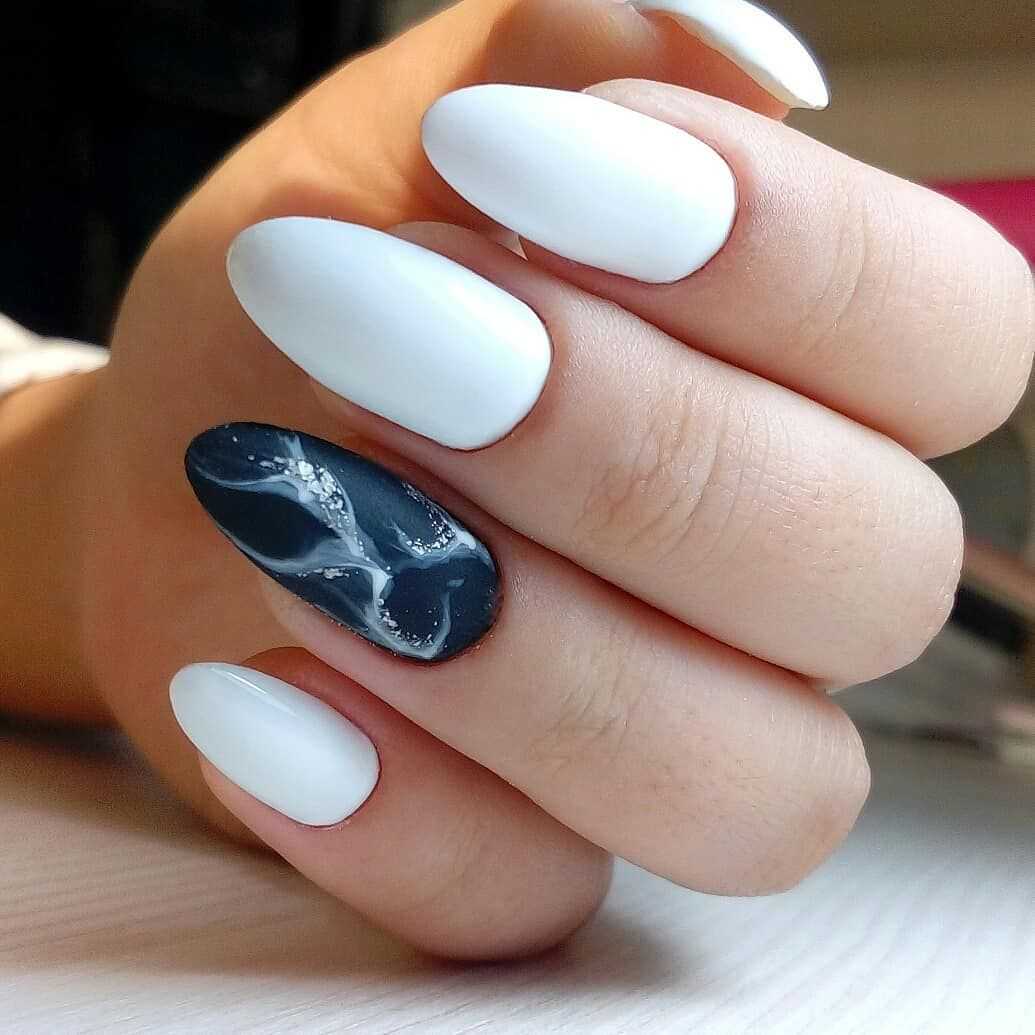 Белый дизайн маникюра отлично подойдет для тех, кто предпочитает свежий и воздушный маникюр. Можете поэкспериментировать и добавить какой-нибудь яркий акцент. Например, небольшой рисунок яркого цвета.