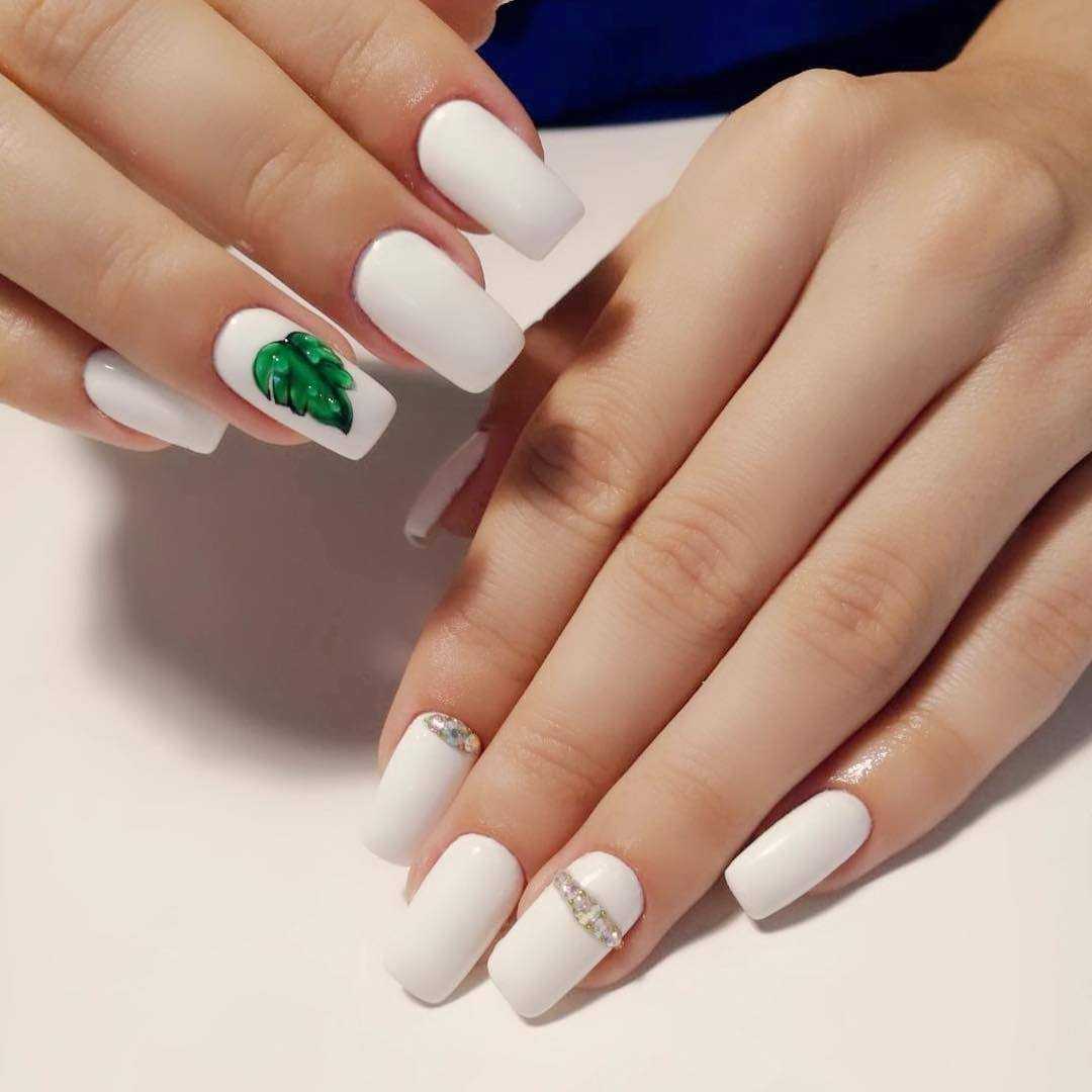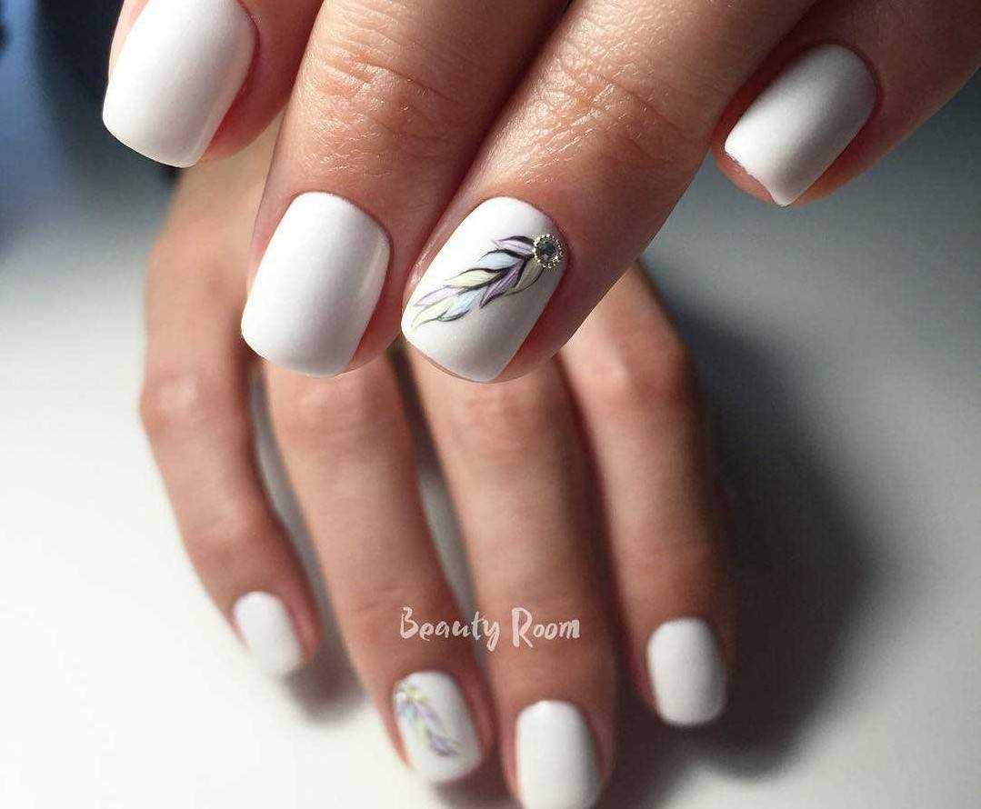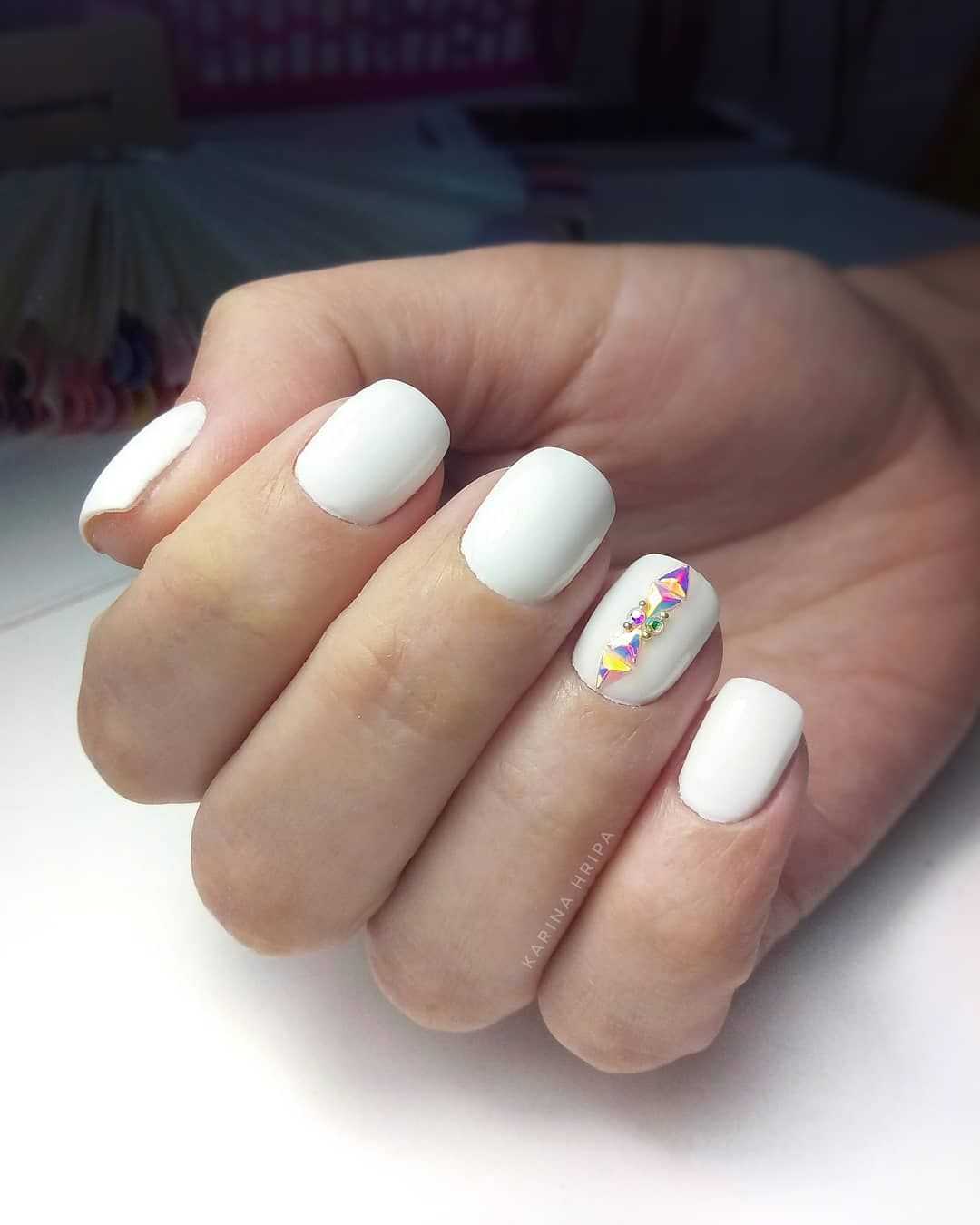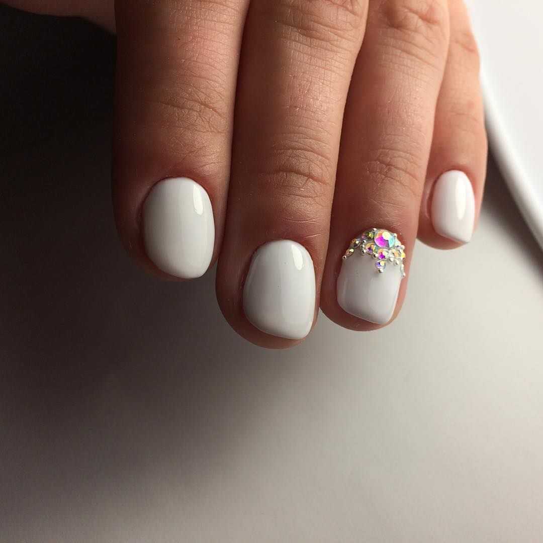 Обладательницы коротких ноготков хорошо знают, что для такой длины самым оптимальным вариантом являются светлые нежные оттенки. Белый цвет – отличное решение для декора коротких ноготков. Что касается техник, то рекомендуется покрывать ноготки однотонным маникюром, использовать акриловую пудру, стразы, бульонки, художественную роспись с флористикой и геометрией.