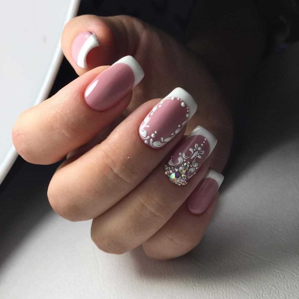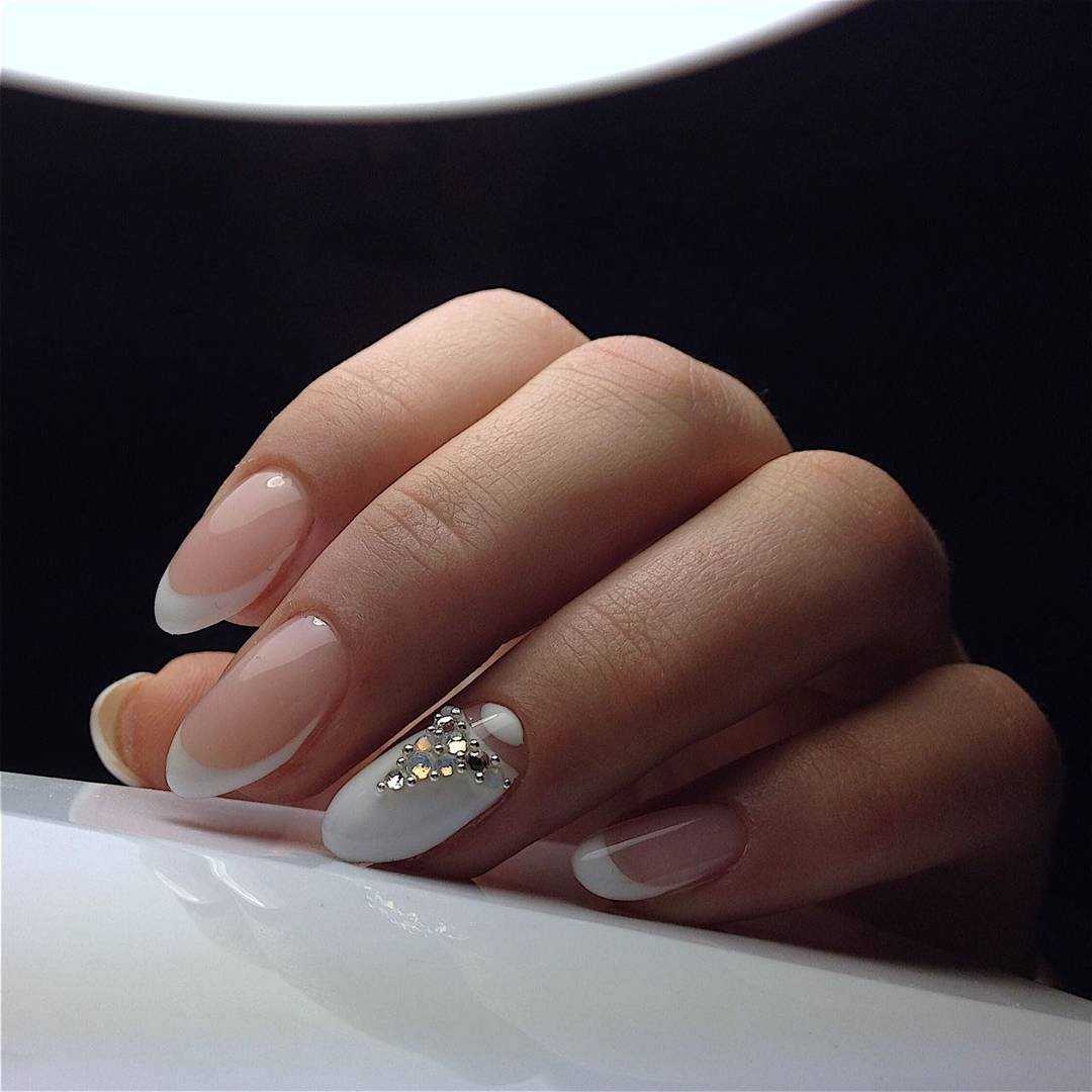 Для создания шикарного маникюра достаточно покрыть ноготки поочередно белым и розовым гель-лаком, дополнить их стразами в прикорневой зоне