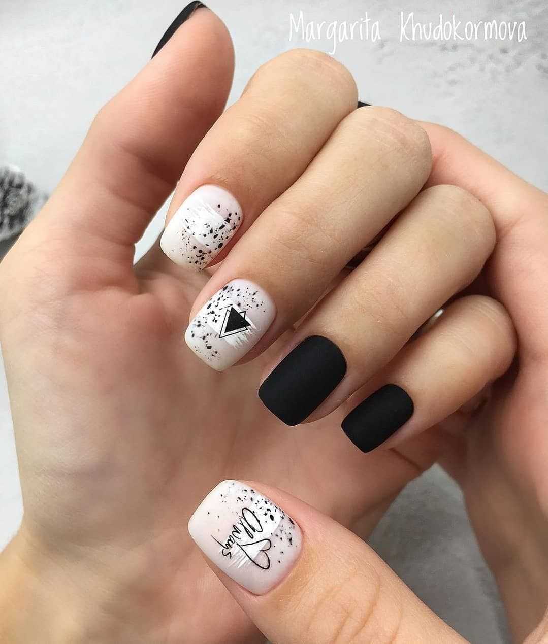 Квадратная форма — это строгость и четкие линии. Маникюр черный с белым как нельзя лучше впишется в такую форму. Оптимальный вариант дизайна — рисунки, в приоритете геометрические рисунки, леттеринг.