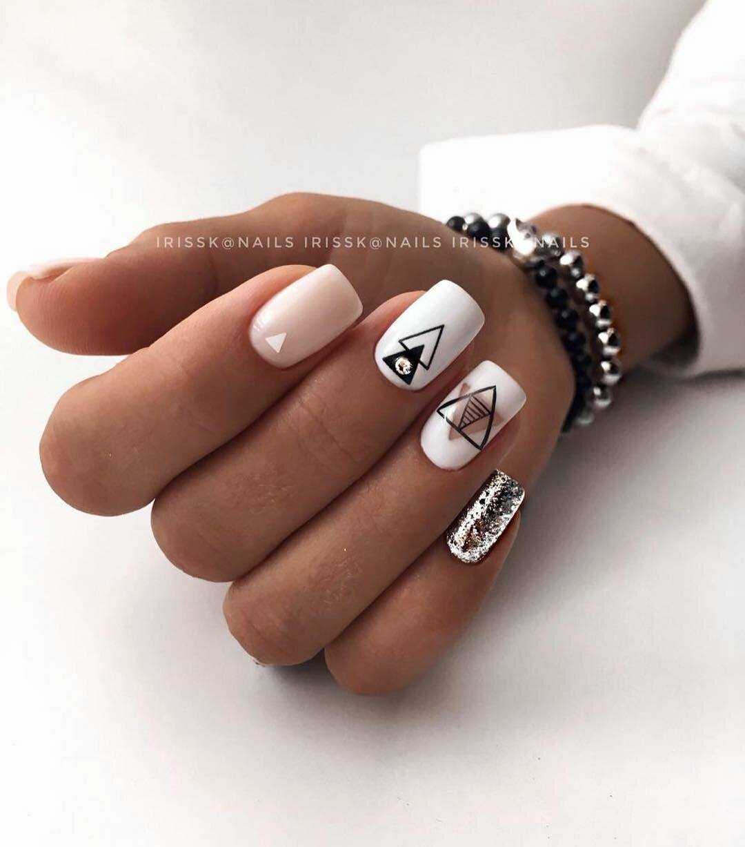 Квадраты, овалы, круги, треугольники и ромбы прекрасно будут смотреться на ногтях. Главное правило – они должны быть совсем малого размера. Цветовую гамму рекомендуется выбирать из более темных тонов. Здесь помогут акриловые краски с кистью, наклейки и слайдеры.