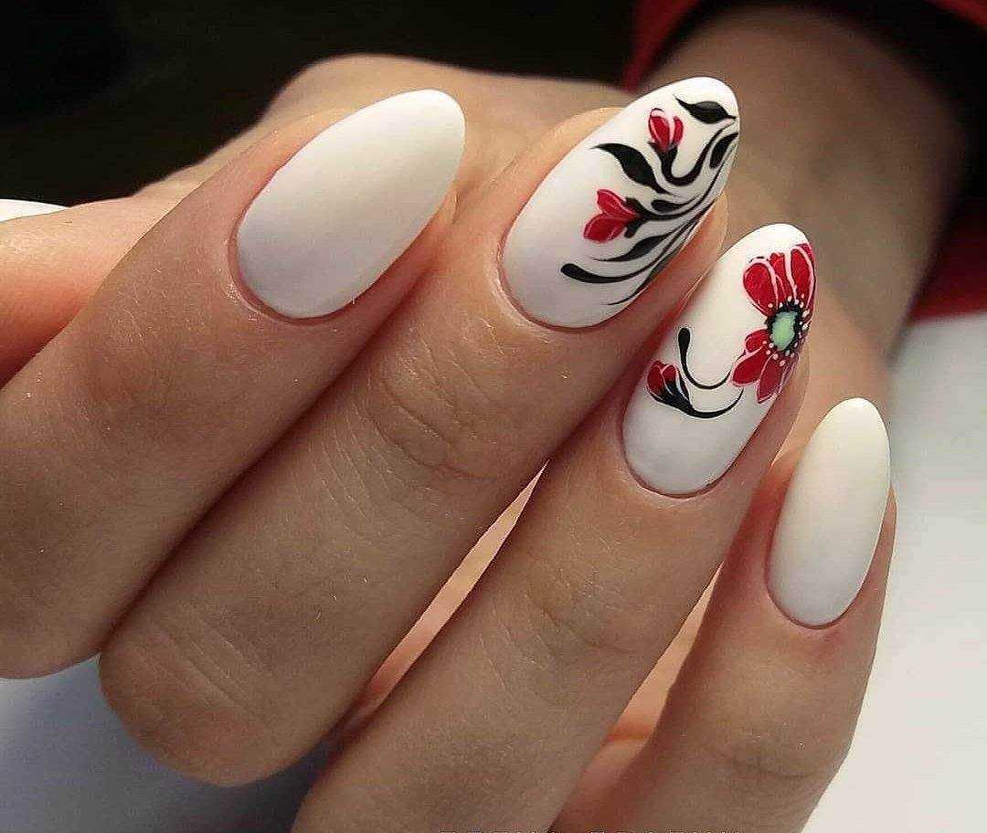 Для тех девушек, которые просто не могут отказаться от флористического принта, зима 2023 года предлагает цветы в красном тоне. Это могут быть совершенно любые цветы, которые можно рисовать лаком, акриловыми красками, выкладывать из страз или просто использовать наклейки.