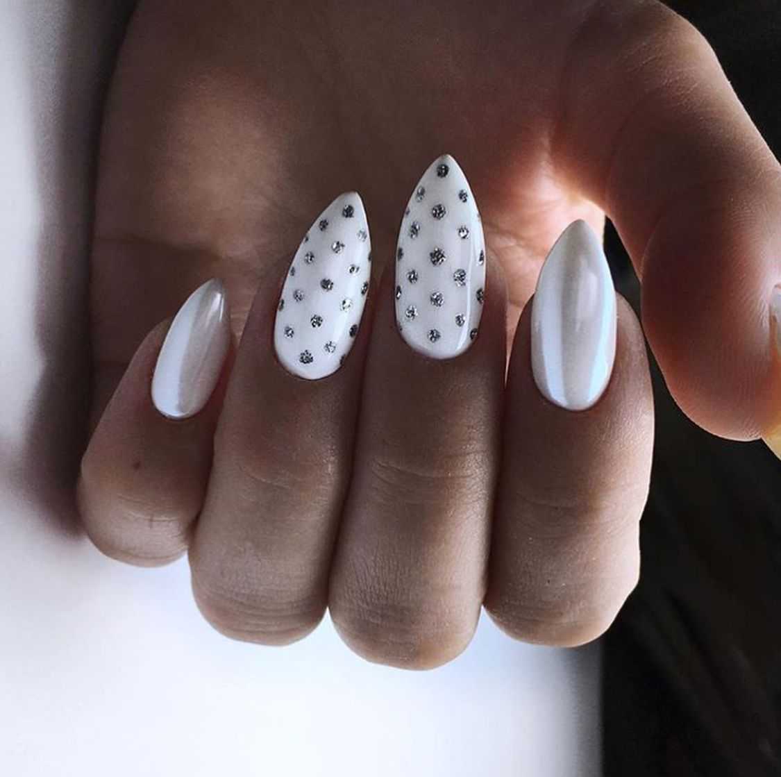 Стильно и эффектно будут смотреться длинные миндалевидные ноготки черного цвета, украшенные серебристыми блестками.