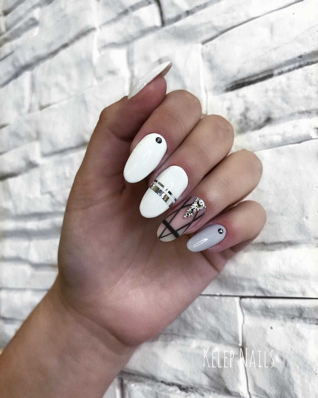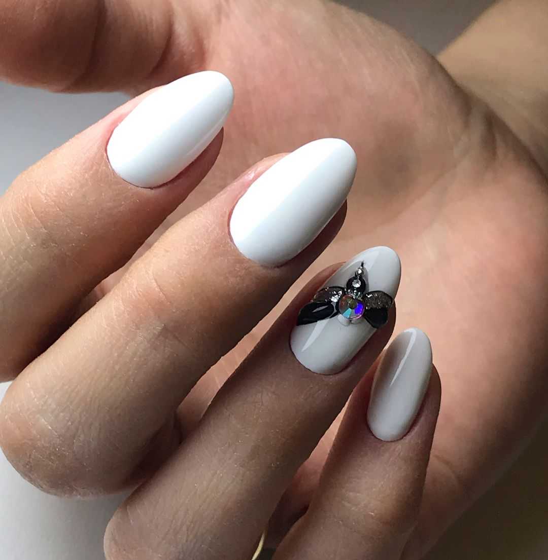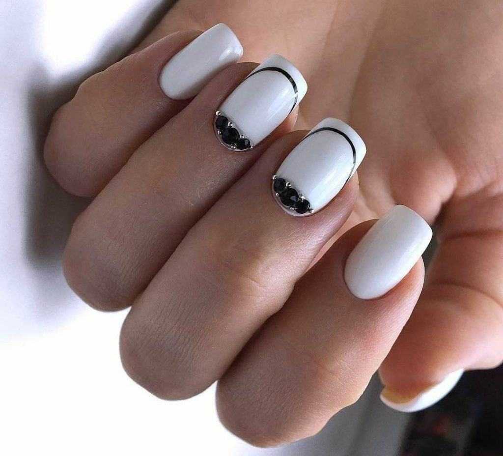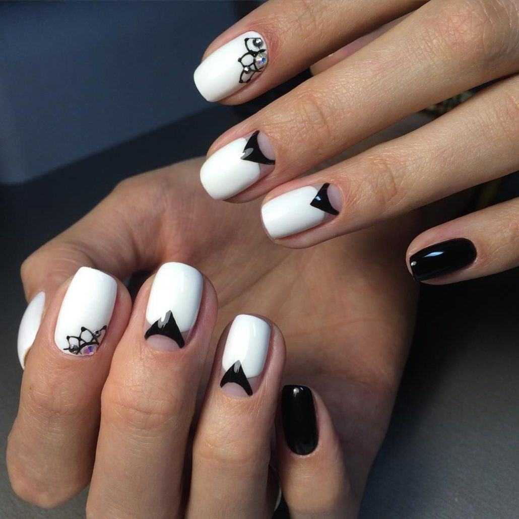 Черный и белый оттенки лака в маникюре отлично подходят для любой формы и длины ногтей. Разница заключается только в виде дизайна. Например, для короткой пластины не очень подойдет дизайн со стразами, который утяжелит и скроет пластину.