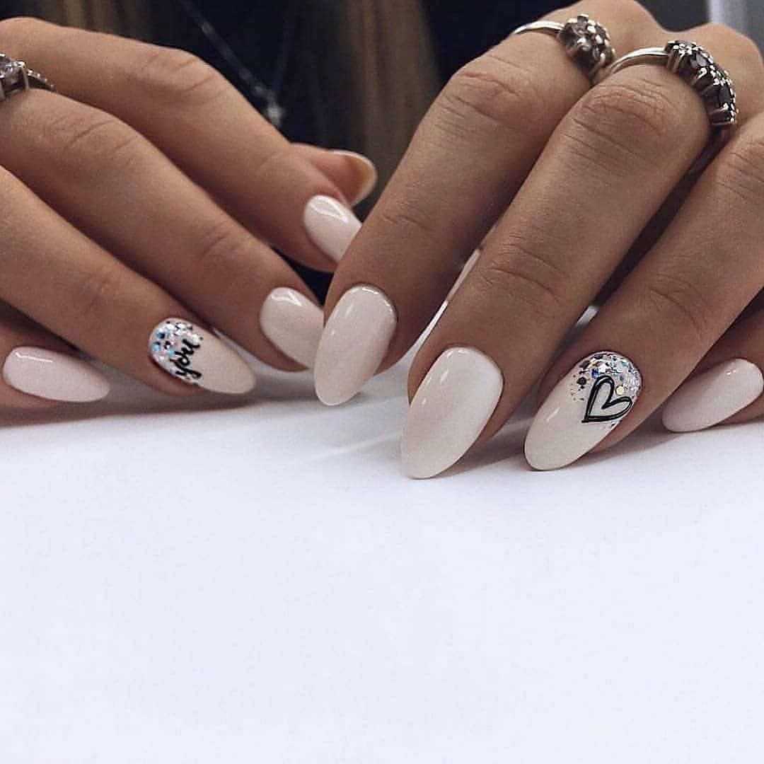 Хорошо использовать с нюдом и глиттер, но при этом важно выбирать нежные и сдержанные оттенки. Вы можете также как и с белым нюдом накрасить всего лишь один ноготь, а можно добавить немного глиттера сверху нюда
