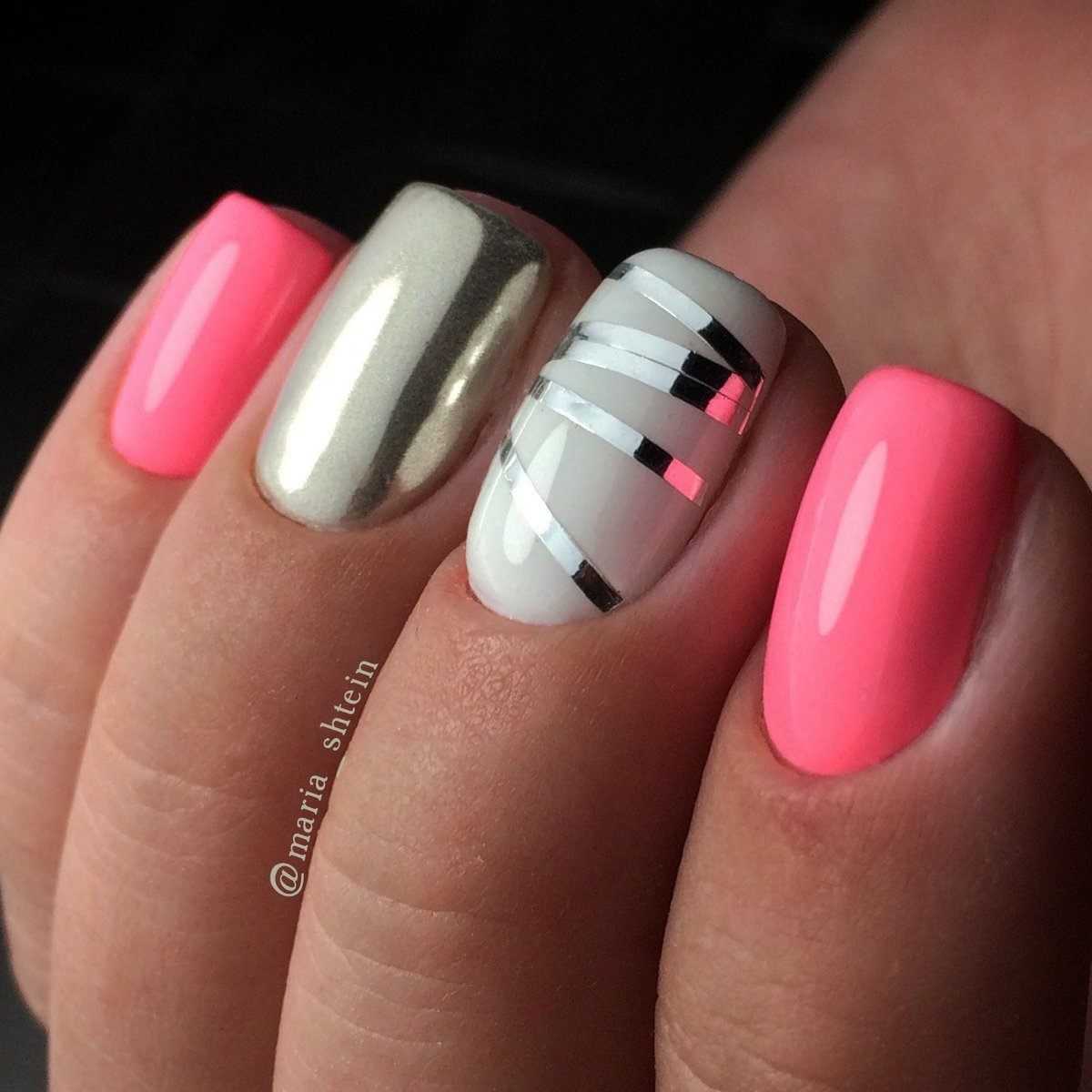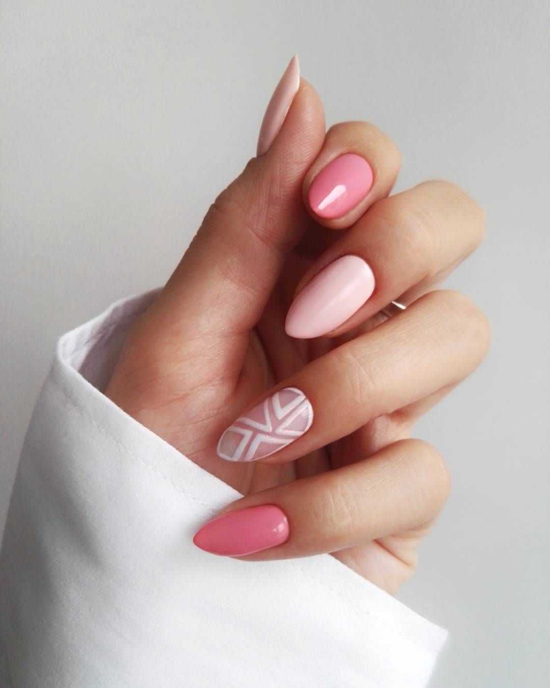 Розовый оттенок считается женственным, мягким и спокойным. Его следует применять отдельно либо совместно с другими теплыми тонами. Это омбре, градирование, френч, в виде геометрических фигур. У образа появится элегантность и изысканность.