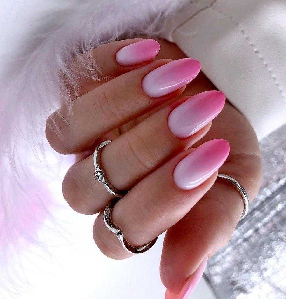 Шикарно выглядит градиентный маникюр в бело-розовом цвете. Белый цвет чаще всего расположен в прикорневой зоне с постепенным переходом в розовый. Выполнять такой градиент лучше на длинных миндальных и квадратных ноготках.