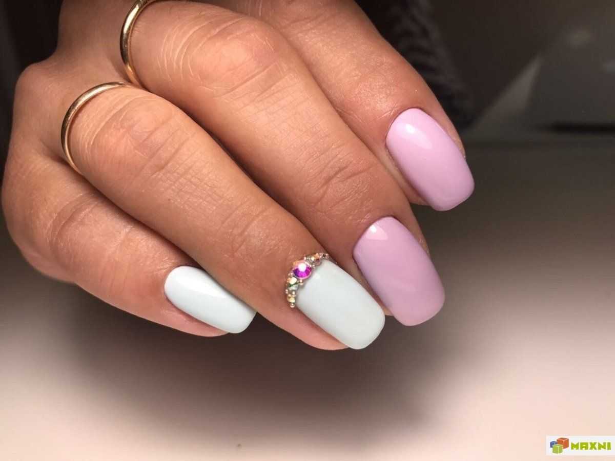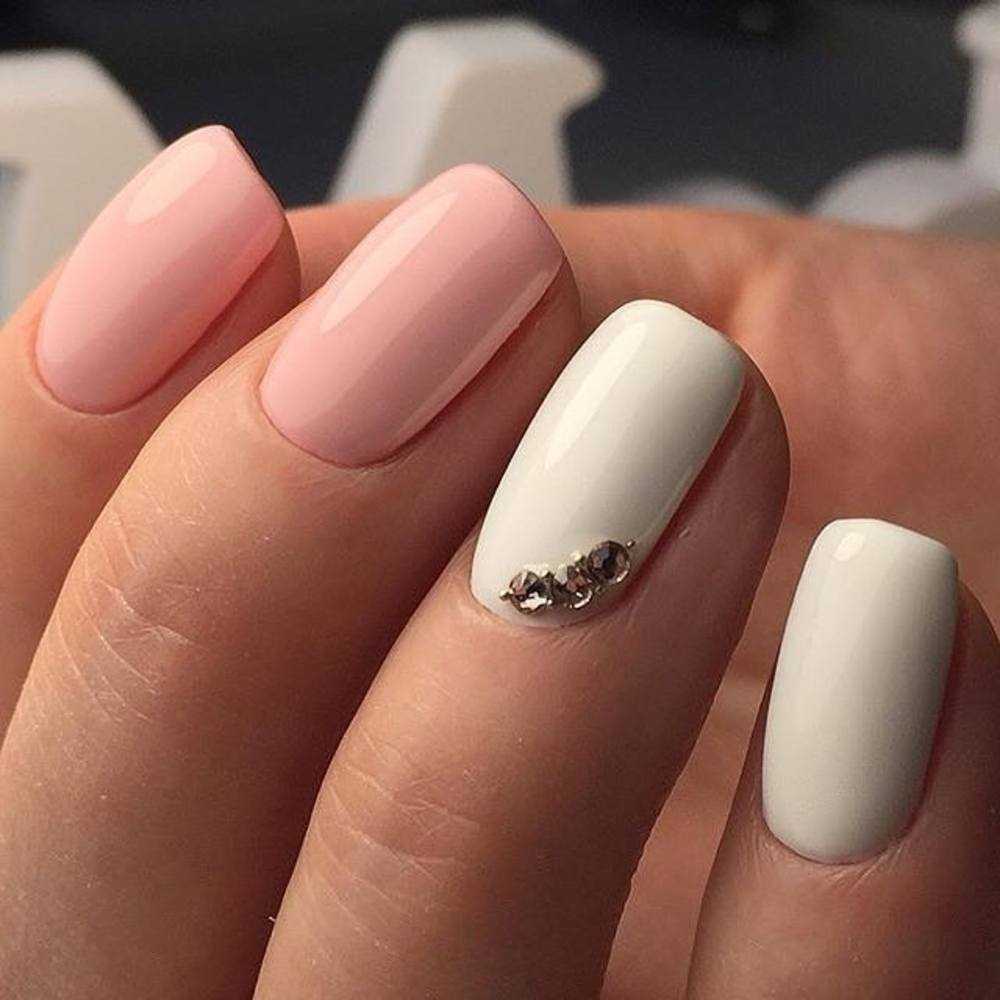 Сочетание белого и розового выглядит очень женственно и изящно. Для создания шикарного маникюра достаточно покрыть ноготки поочередно белым и розовым гель-лаком, дополнить их стразами в прикорневой зоне.