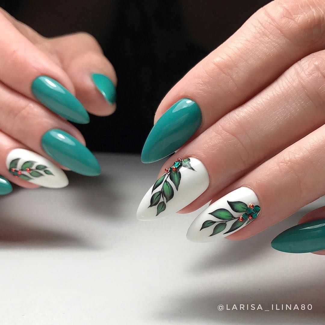 Зеленая ель — символ праздника. Зеленый маникюр станет действительно праздничным, если выбрать матовое покрытие, украсить базу шариками, гирляндами или акриловой пудрой.