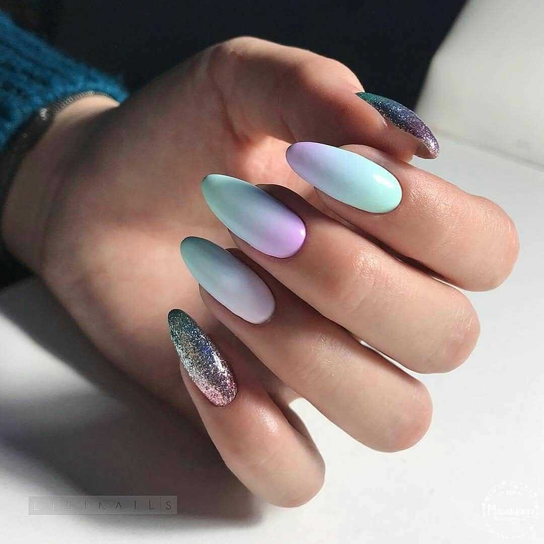 Всем знакомый обычный градиент теперь делают с блёстками. Для начала необходимо сделать обычный градиент из цветного лака, а уже потом украсить его блёстками для красоты.