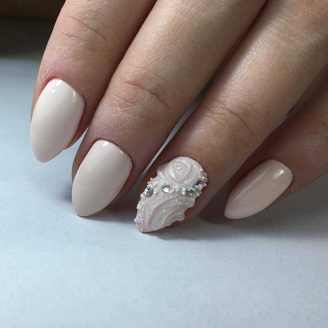 Овальная форма ногтей — это классическая вариация маникюра, которую можно удачно дополнить бежевым лаком. Он станет продолжением строго образа, не привлекая к себе внимания. Если добавить другие цвета, то благодаря этой форме можно осуществить различные идеи на ногтях — полосы, горох, градиент, цветы.