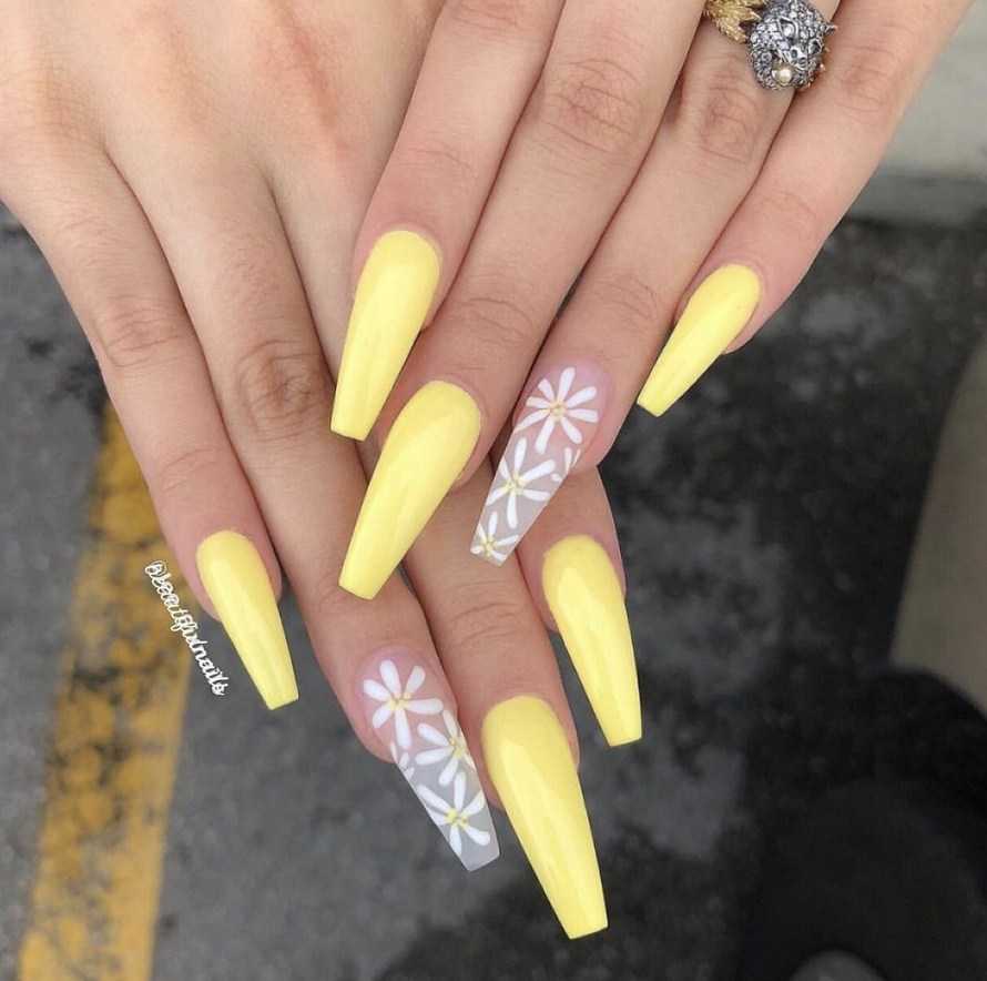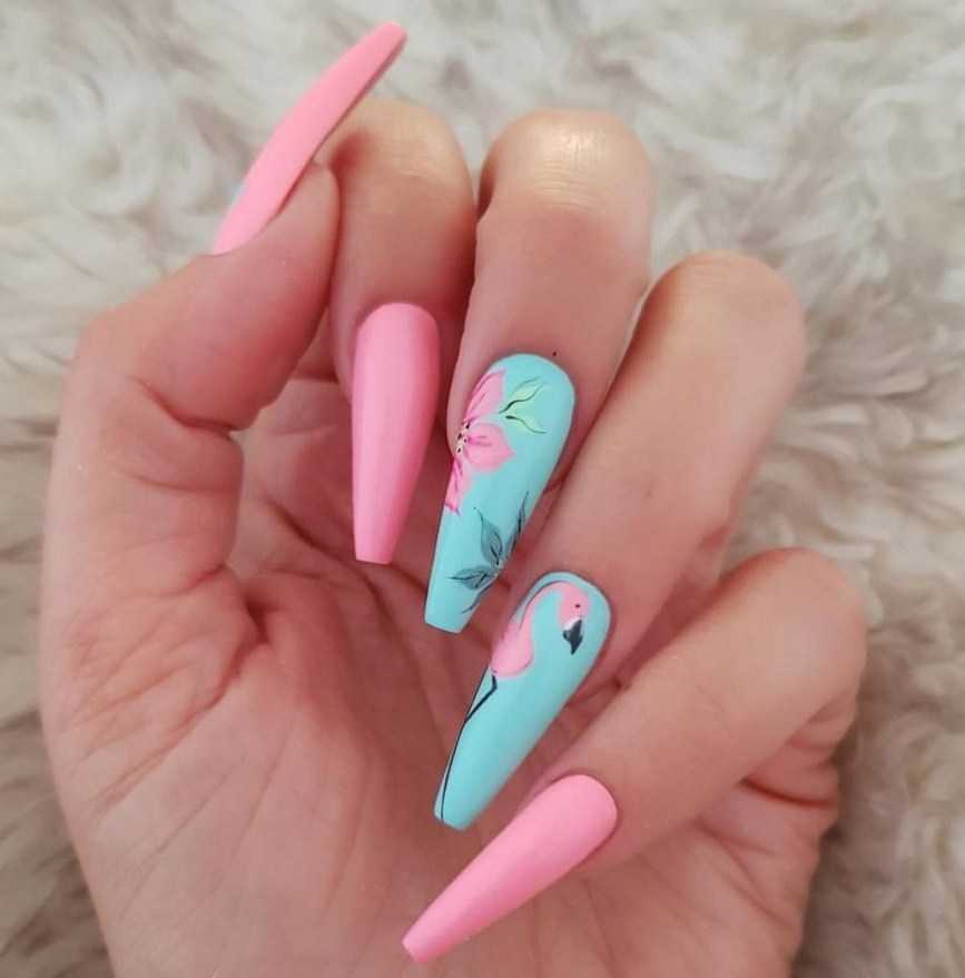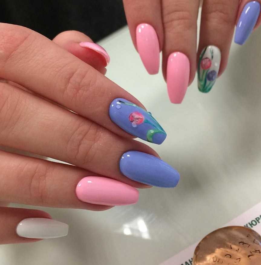 Можно использовать расписной дизайн ногтей на балерину. Он рискованный из-за своей яркости и необычности. Нарисовать можно все что угодно: от травяных орнаментов до животных. Расписной маникюр на ногтях данной формы точно выделит вас из толпы